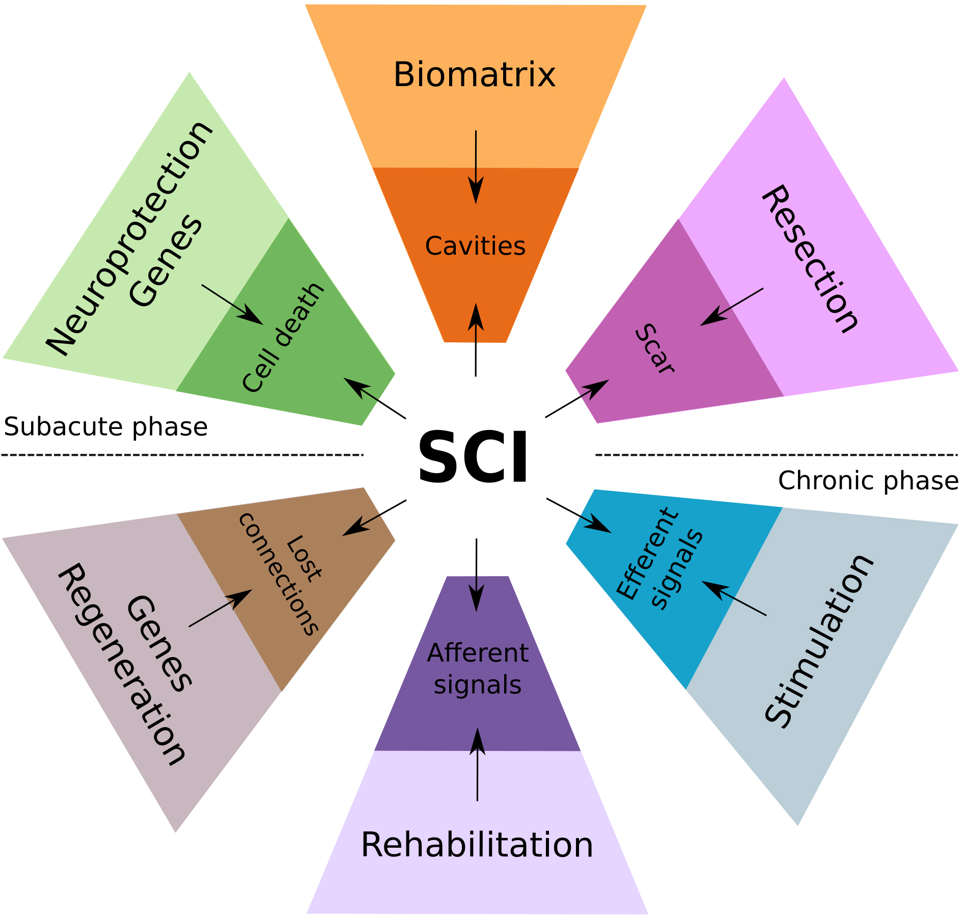 Fig. 1.Conceptual diagram of the mechanisms-based combinatorial approach for the therapy of SCI, integrating regenerative, neuromodulation, and rehabilitation therapies.