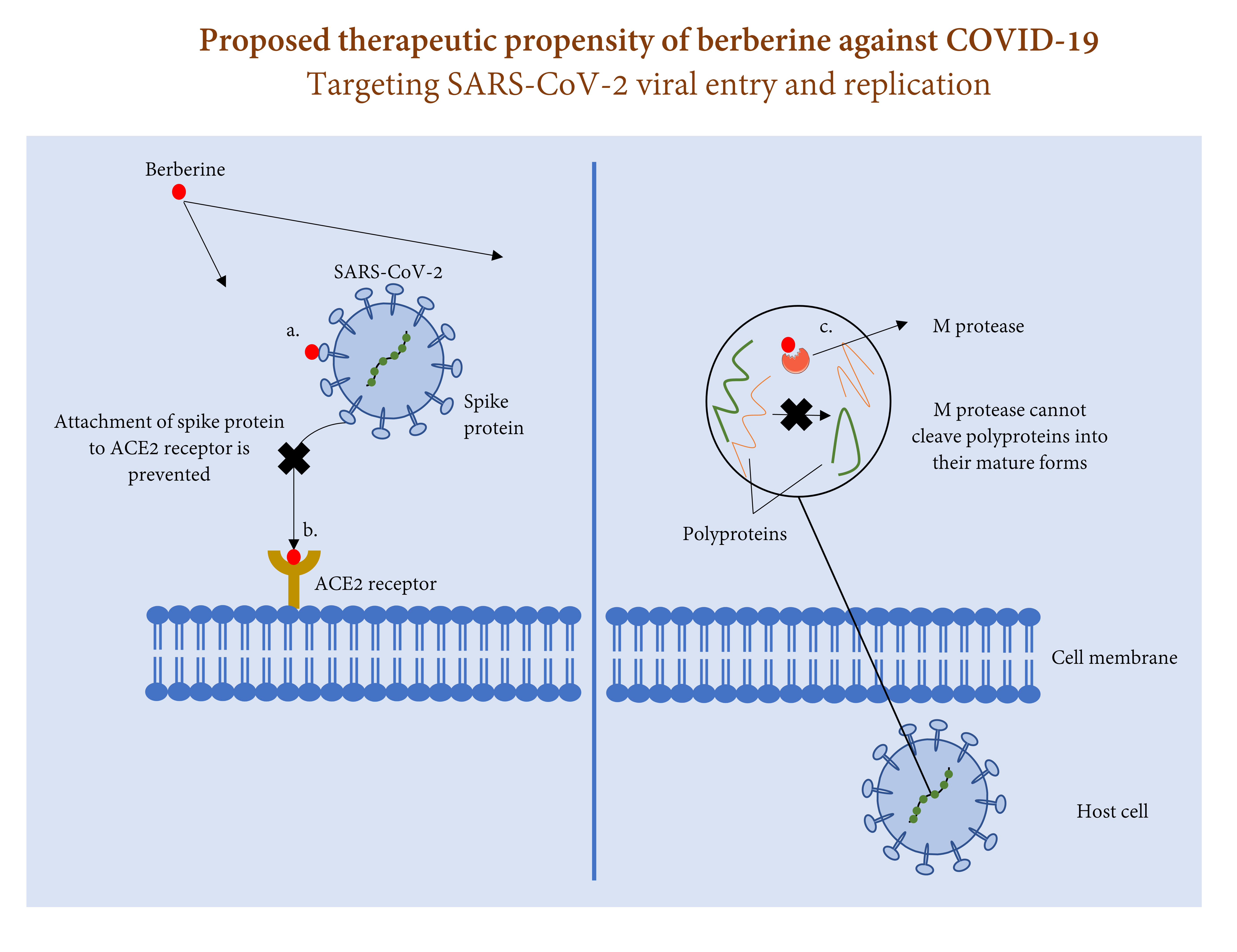 Fig. 1.Process of SARS-CoV-2 entry and replication in host cell and the therapeutic role of berberine against this process. Berberine may prevent SARS-CoV-2 entry to host cell via (a) attaching to spike protein, and/or (b) attaching to ACE2 receptor. Berberine may also halt SARS-CoV-2 replication via (c) attaching to M protease and preventing cleavage of polyproteins 1a and 1ab into their mature forms.