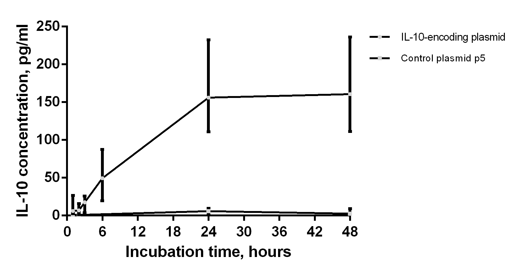 A tolerogenic response can be induced by suppressive cytokines, such as IL-10 and TGF-beta. One technique to preserve the immature DC phenotype after in vivo delivery is the genetic modification of DCs with viral vectors expressing IL-10 and TGF-beta, because the continuous expression of these cytokines prevents the maturation of DCs. In our study, the pIL-10 plasmid was used to induce a stable, nonspecific, and tolerogenic phenotype of dendritic cells. The supernatants of cultured dendritic cells were collected at 1, 2, 3, 6, 24, and 48 h after transfection to determine the content of IL-10 using an enzyme-linked immunosorbent assay. IL-10 production upon cultivation of transfected DCs increased as early as the first hours after transfection and up to 24 h. Cytokine production reached a plateau between 24 and 48 h (Fig. 1). The control plasmid p5 did not induce IL-10 production. Similarly, we previously showed that the data obtained in mouse models were consistent with previous studies using the plasmid encoding murine IL-10 [19].