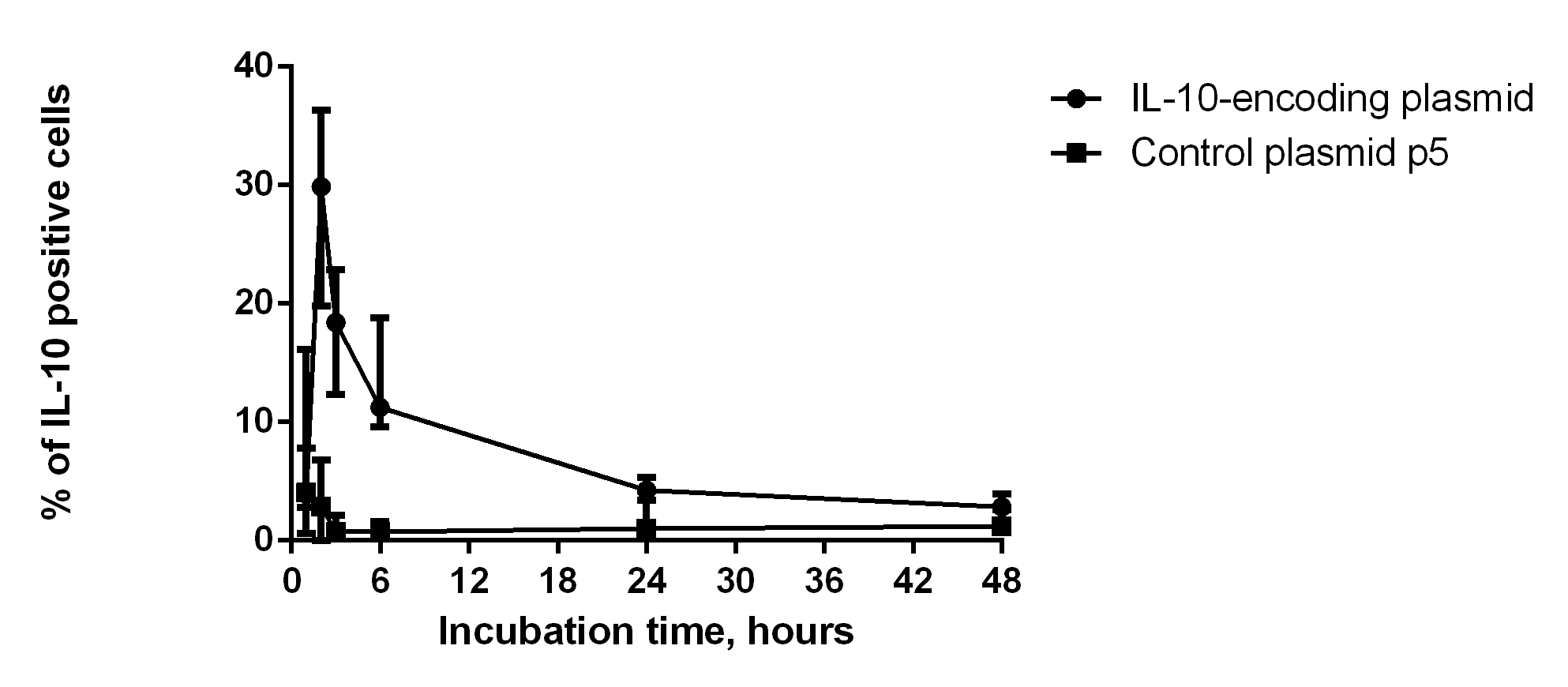 Results of flow cytometry assessment of intracellular IL-10 in dendritic cells in 1, 2, 3, 6. 24 and 48 h after transduction (Fig. 2) showed that the relative number of cells expressing intracellular IL-10 increased significantly on hour 2 after transduction. The relative number of dendritic cells transfected by control p5 plasmid was under 5% during 48 h after the transfection.