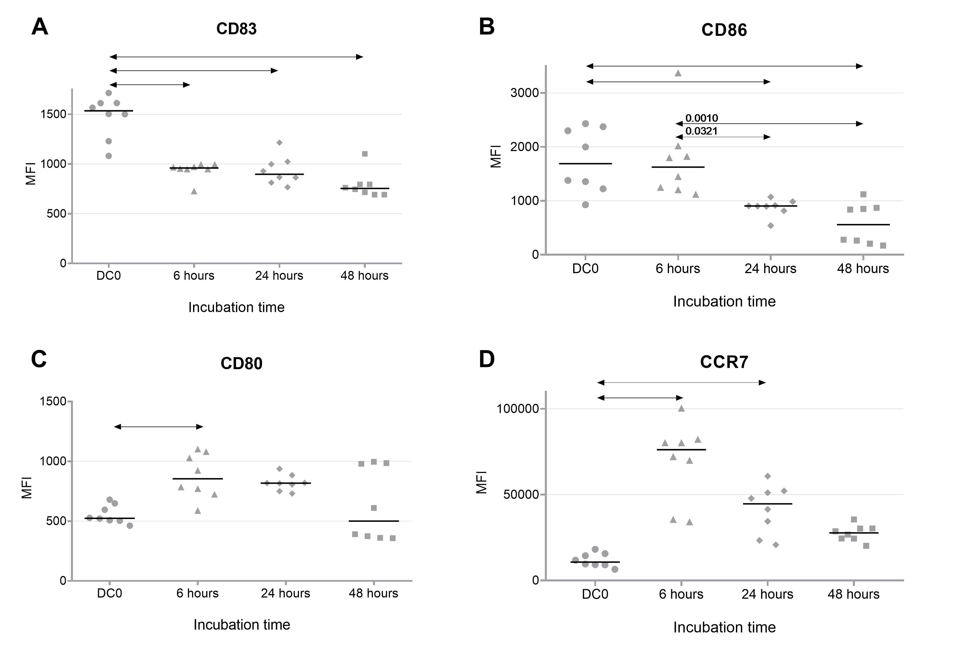 and CCR7 (D) at 6, 24, and 48 h after transfection with a plasmid encoding IL-10