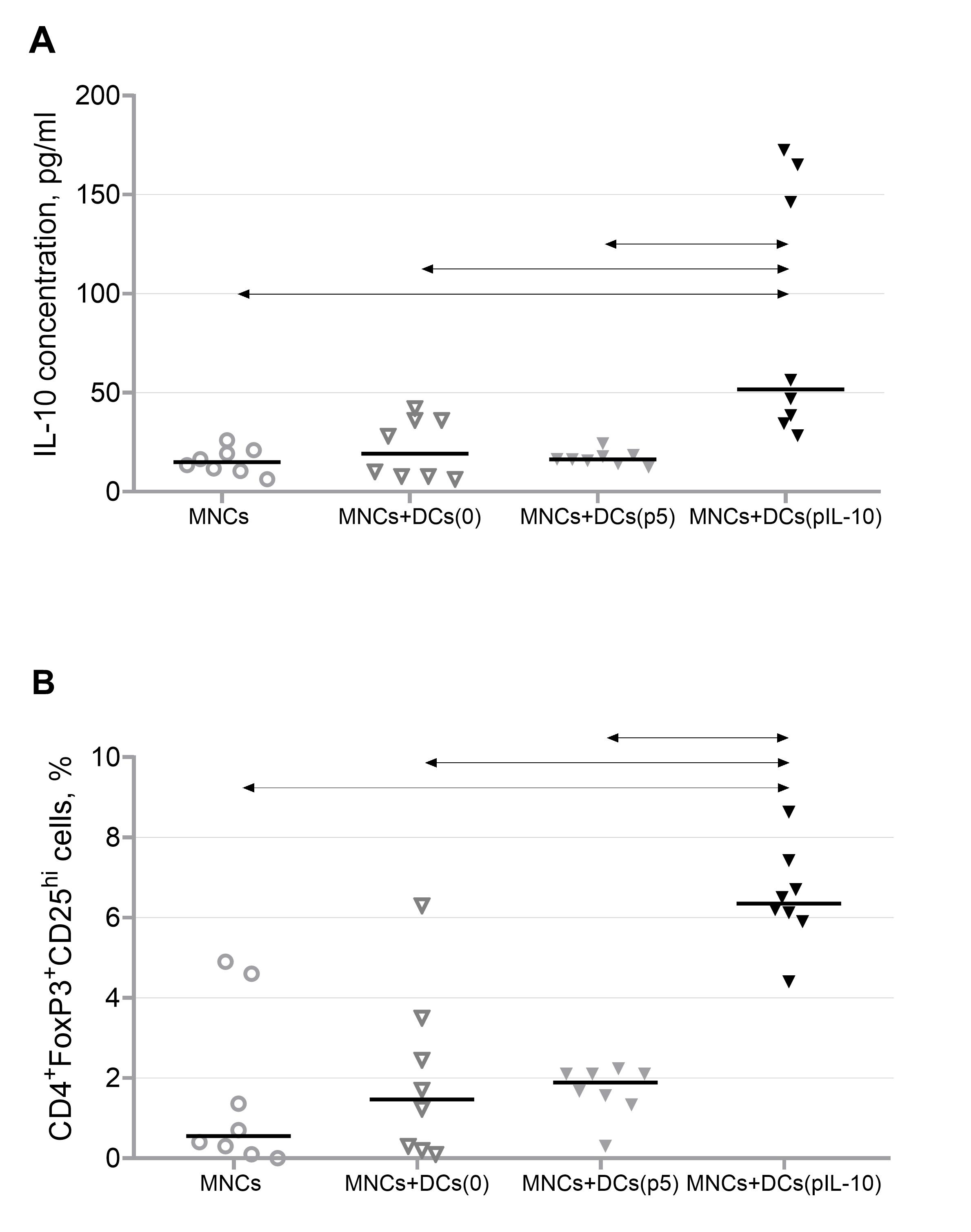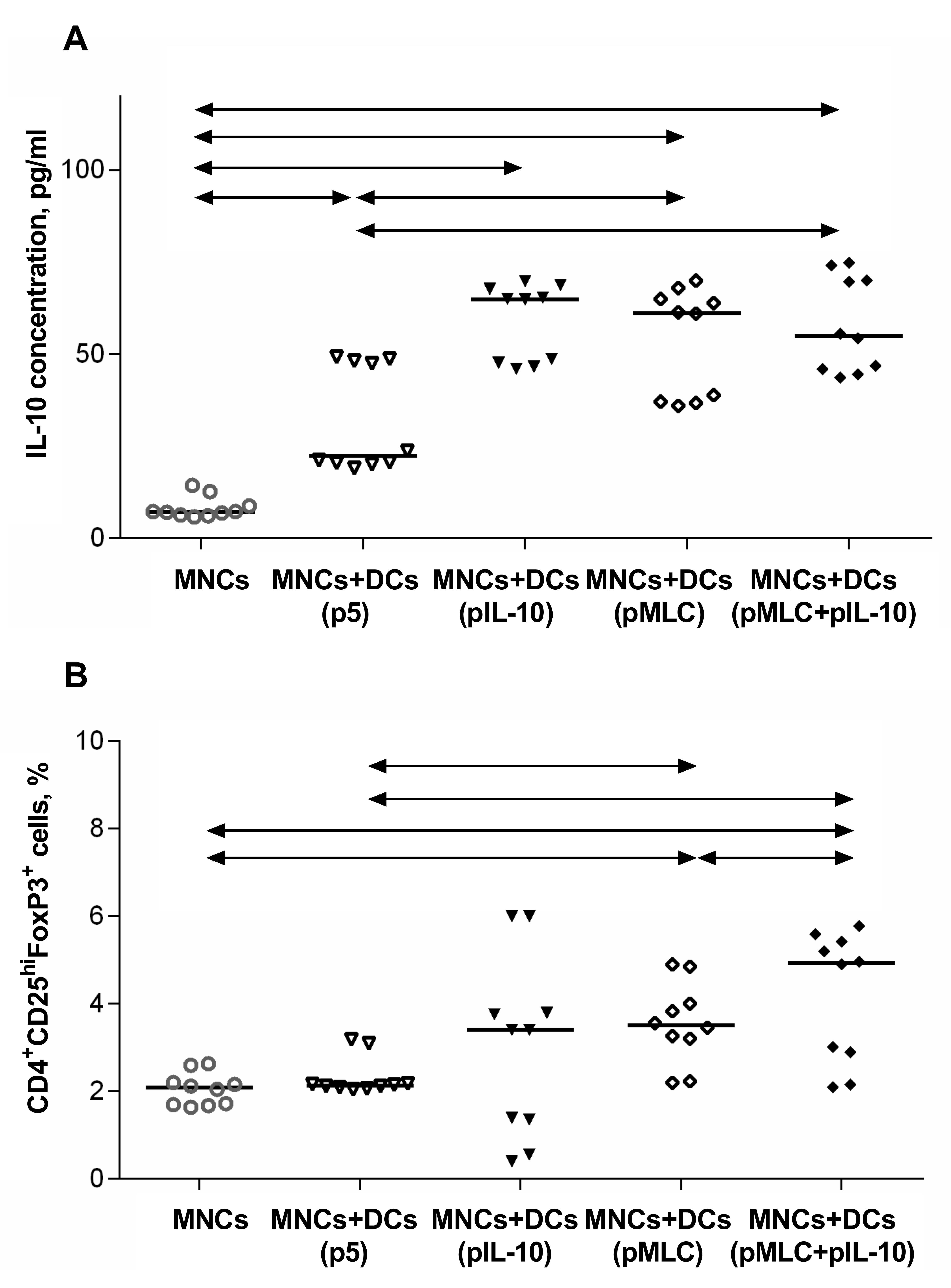 To evaluate the possible effects of pIL-10-transfected tolerogenic DCs on a culture of mononuclear cells, the pIL-10-transfected DCs were co-cultured with autologous mononuclear cells (non-adherent PBMC fraction) at a 1:10 ratio at 6 h after transfection.