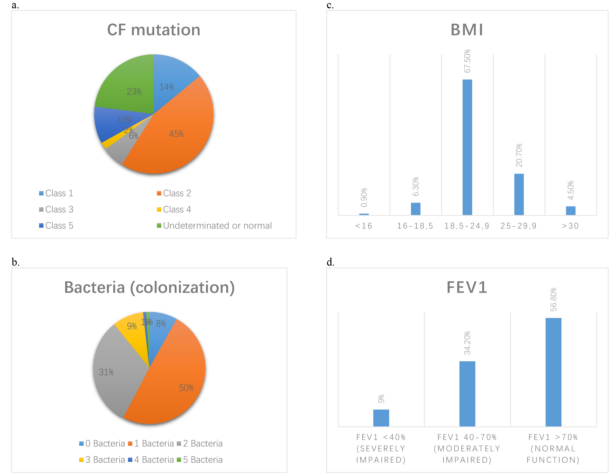 Fig. 1.Patient characteristics. (a) CFTR type of mutations. (b) Number of bacteria of lung colonization. (c) BMI distribution of the population. (d) FEV1% distribution of the population.