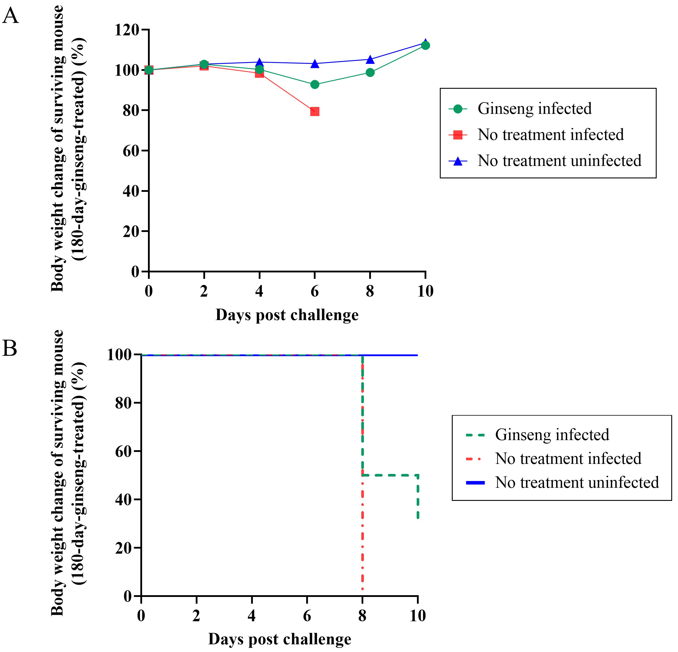8 days p.i. Three out of the ten ginseng-fed infected mice survived, resulting in