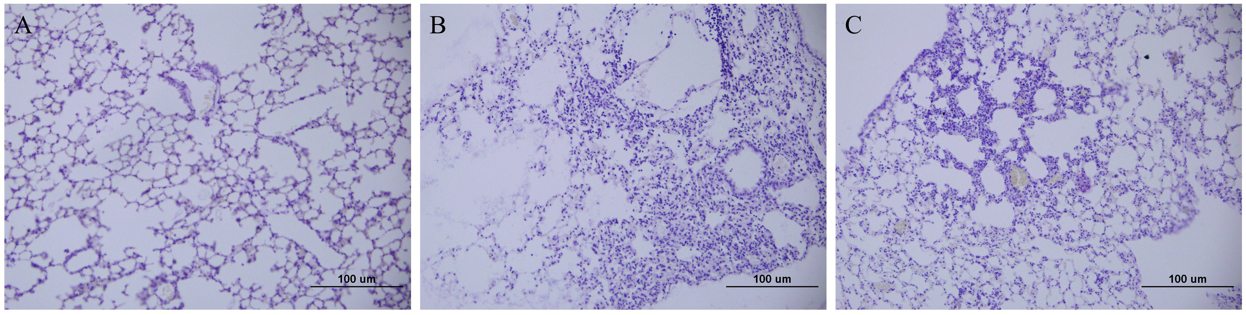 The lung tissues of mice were stained with hematoxylin and eosin to determine the histopathological changes caused by SARS-CoV-2 infection (Fig. 3). The lung tissue of ginseng-fed infected mice showed much milder interstitial pneumonia (Fig. 3C) than that of infected mice not fed ginseng (Fig. 3B). The lung tissues of uninfected mice not fed ginseng did not show interstitial pneumonia (Fig. 3A).