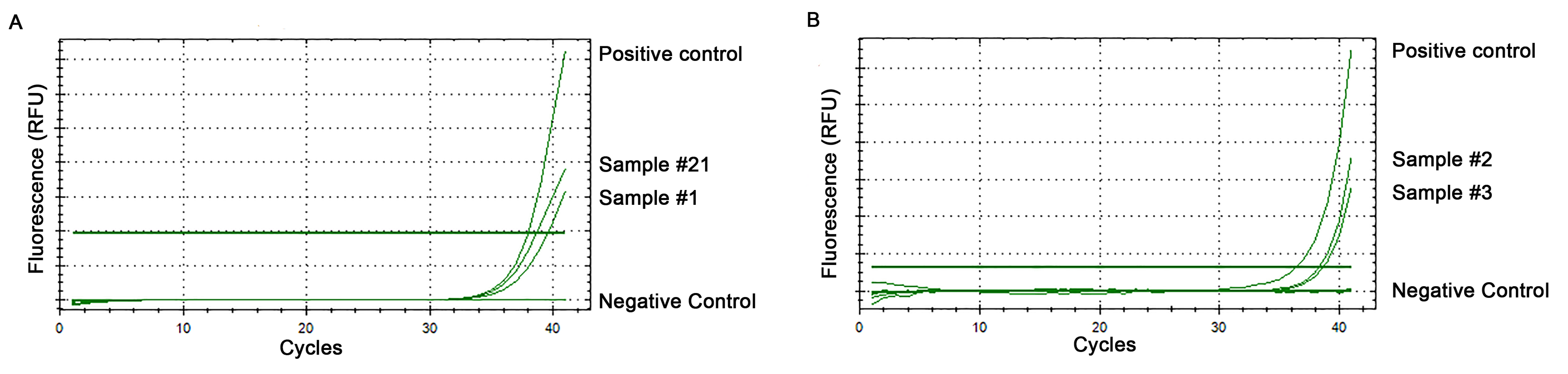 Fig. 1.Real-time detection of HCV RNA and HIV-1 proviral DNA positive controls and samples by RT-qPCR. (A) HCV RNA amplification curves of the positive control, negative control, and samples 21 and 1. (B) HIV-1 proviral DNA amplification curves of the positive control, negative control, and samples 2 and 3.
