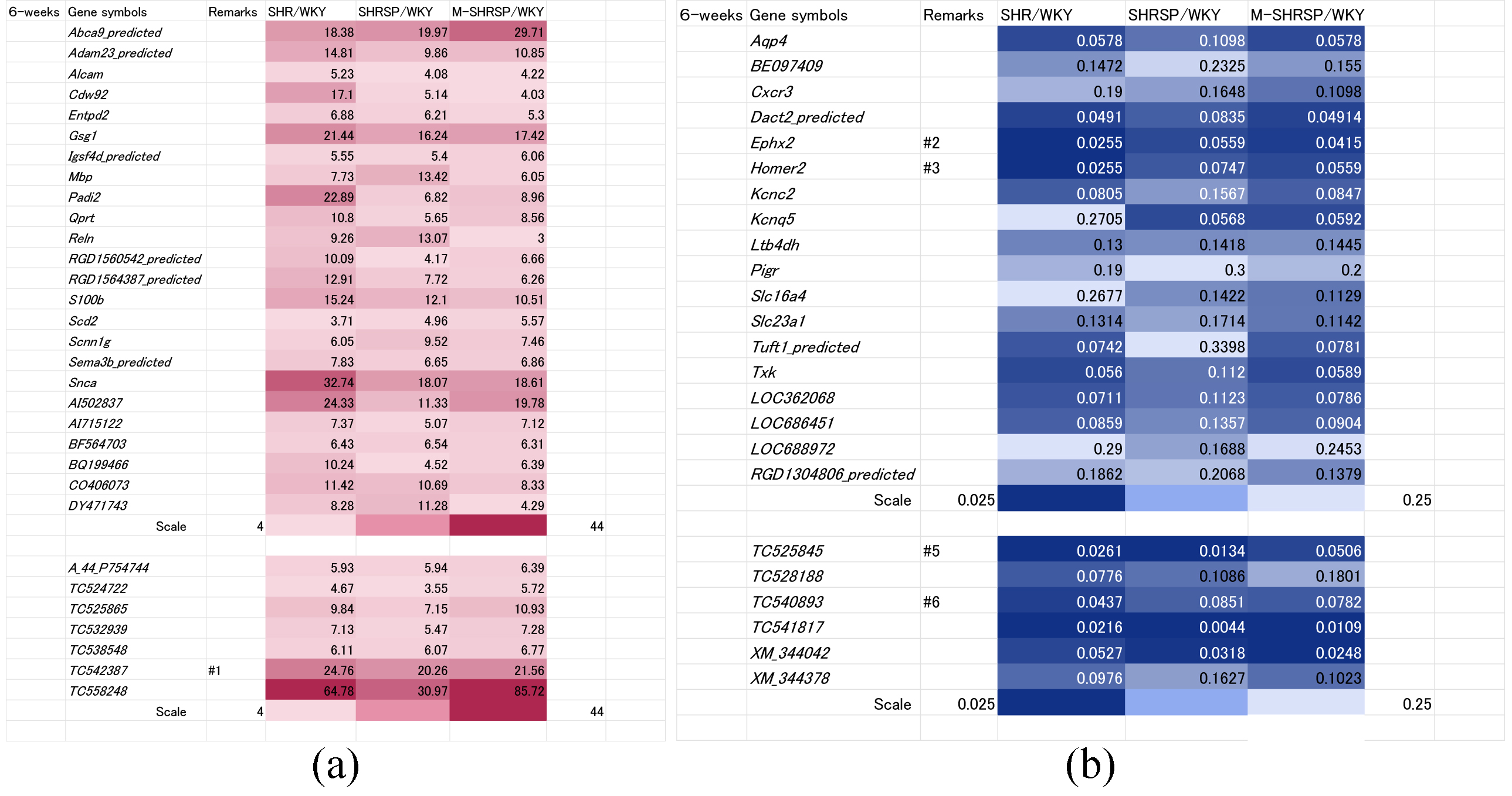 Fig. 2.Genes significantly up or down regulated in all three SHR substrains at 6-weeks of age vs age-matched WKY controls. Genes either up regulated more than 4-fold (a) or down regulated less than 0.25-fold (b) in all three SHR substrains (SHR, SHRSP or M-SHRSP) compared to age-matched WKY are expressed in heat maps. The color grading corresponds to fold-changes in gene expression, as illustrated by the scale shown in the final row. Numbers shown in the remarks column refer to the duplication of gene data from other figures. WKY, Wistar Kyoto rats; SHR, spontaneously hypertensive rats; SHRSP, stroke-prone SHR; M-SHRSP, malignant SHRSP.