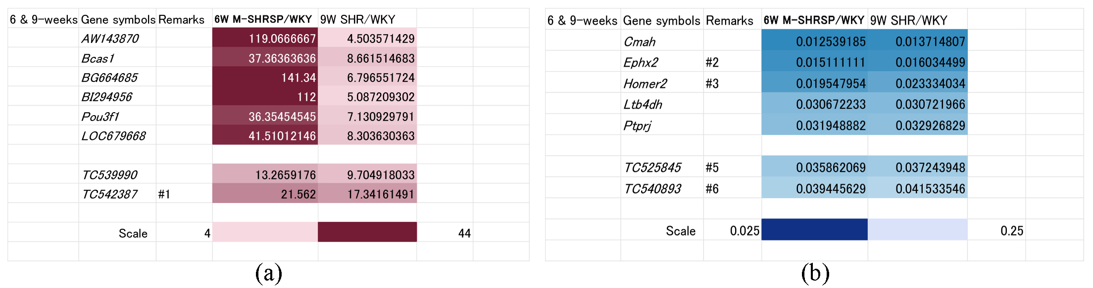 | (Up and down regulated genes in 9-week of old SHRSP/WKY and M-SHRSP/WKY ) | |||