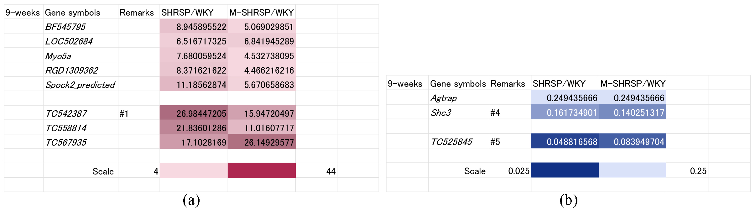 Fig. 4.Genes significantly up or down regulated both in SHRSPs and in M-SHRSPs at 9-weeks of age compared with age-matched WKY. Heat maps show genes either up regulated more than 4-fold (a) or down regulated more than 0.25-fold (b) in both 9-week old SHRSPs and in M-SHRSPs vs age-matched WKY. Numbers shown in the remarks column refer to the duplication of gene data from other figures. WKY, Wistar Kyoto rats; SHRSP, stroke-prone spontaneously hypertensive rats; M-SHRSP, malignant SHRSP.