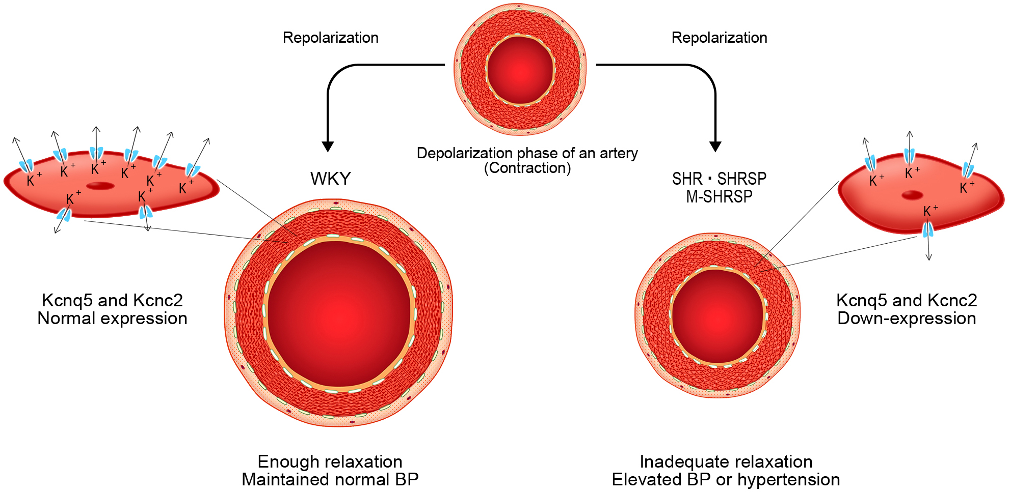 Two genes thought to be directly involved in the onset of hypertension were Kcnc2, and Kcnq5. Fig. 5 shows the proposed action of these genes in more detail.