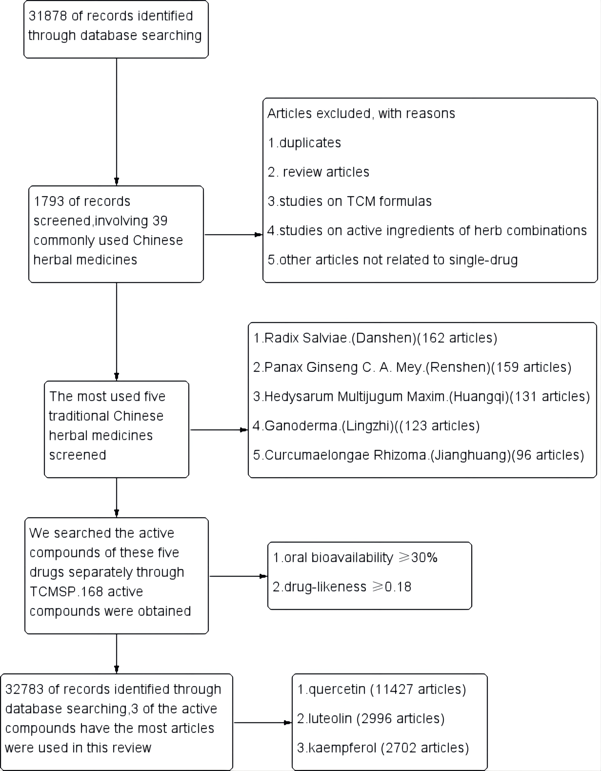 In this review, we searched Chinese and English electronic databases including the CNKI database, Wanfang Data Knowledge Service Platform, VIP Chinese Science and Technology Journal Database, PubMed Database, and Web of Science Database, for relevant studies. All research results from 2000 to the present were selected to obtain the three most commonly used Chinese herbal medicines through screening. The active compounds from the selected medicines were identified using the Traditional Chinese Medicine Systems Pharmacology Database (TCMSP) by analyzing oral bioavailability and drug similarity index. Subsequently, we searched the databases (PubMed and Web of Science) using the keywords for one of the compounds from the TCMSP and “Cancer” or “Tumor” “Carcinoma” or “Malignancy” to obtain articles published from January 2000 to the present.