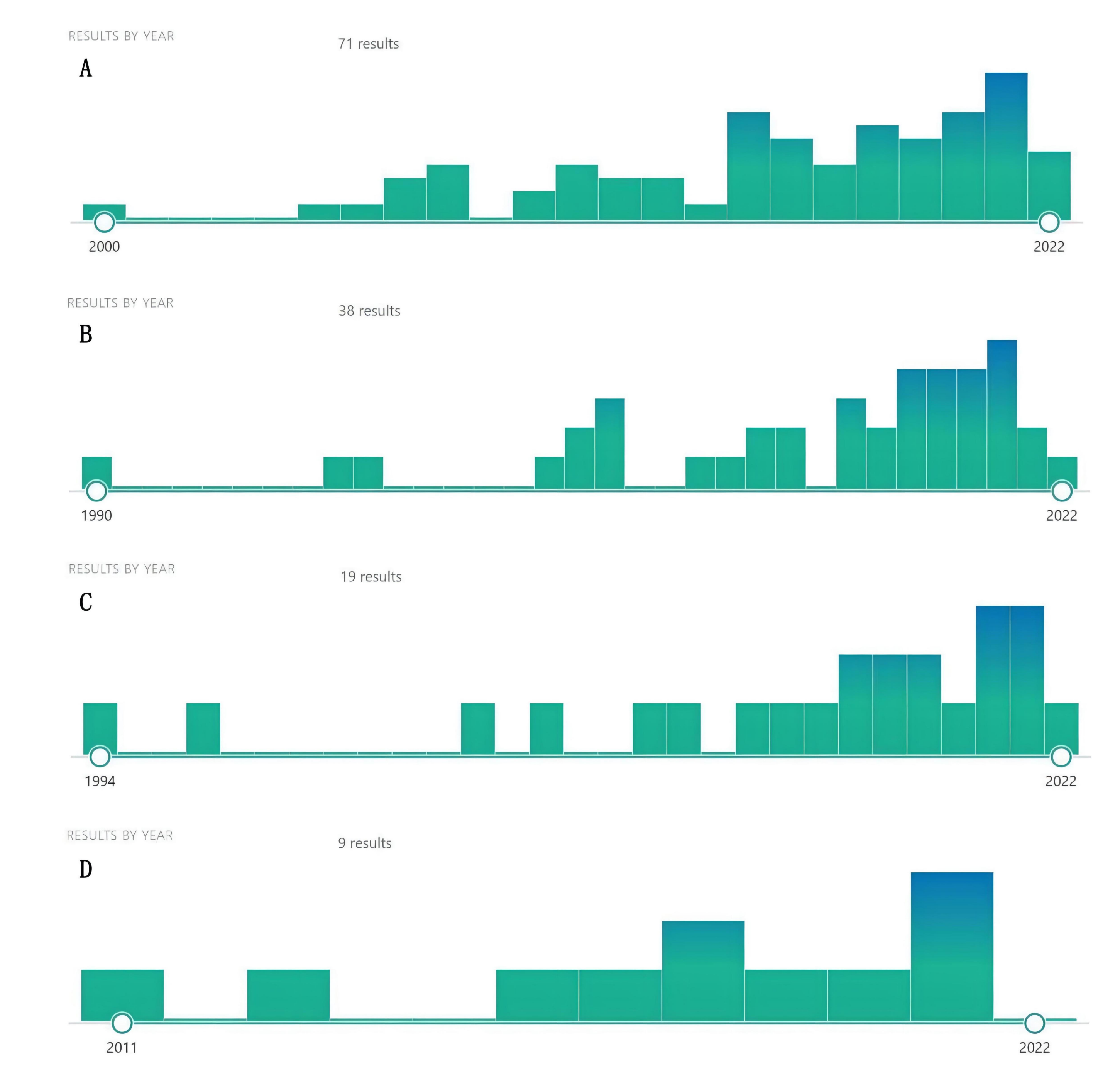 Fig. 3.Increasing literature about dihydrotanshinone (A), Sclareol (B), Isoimperatorin (C), and girinimbin (D) (From PubMed).