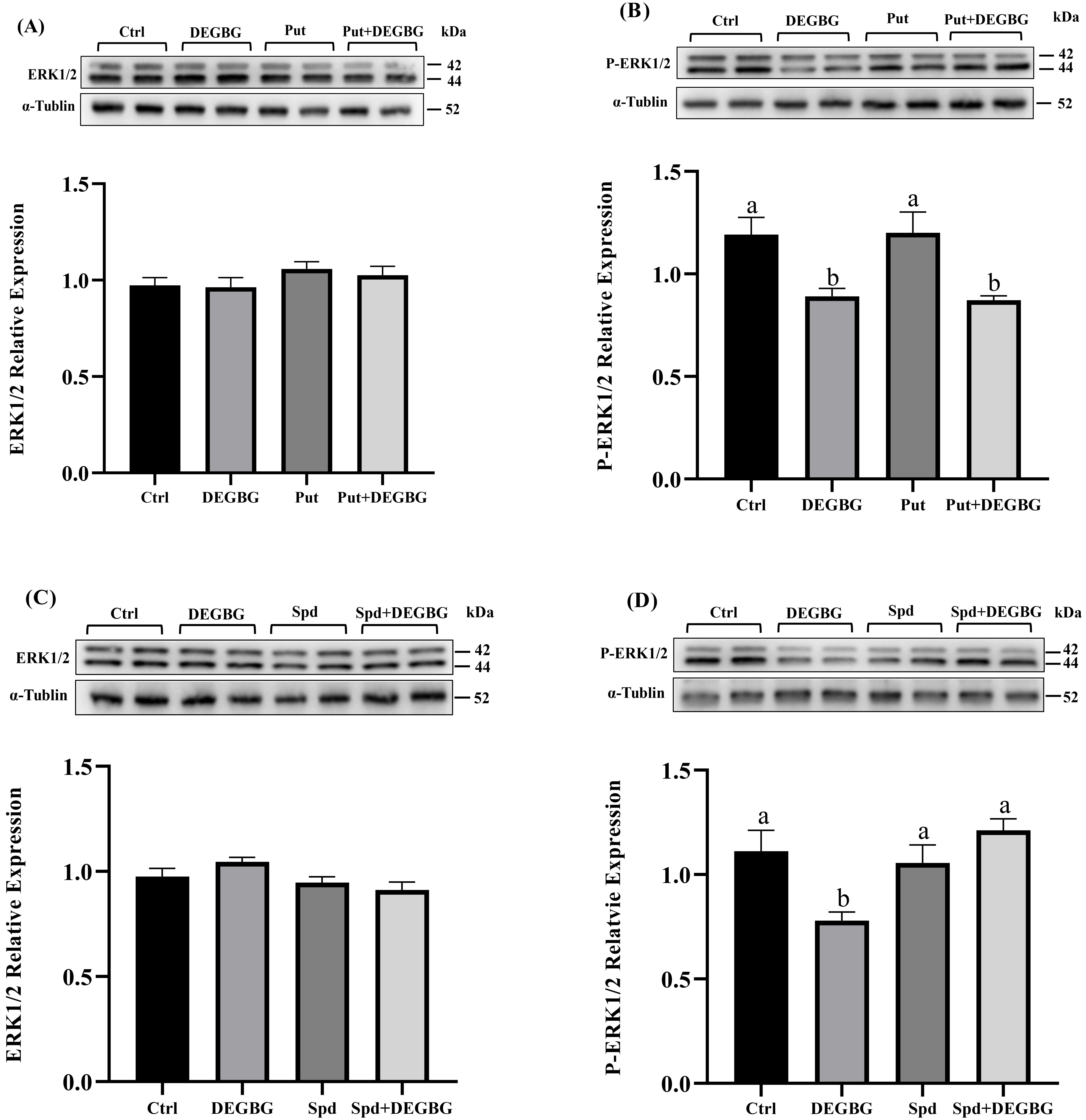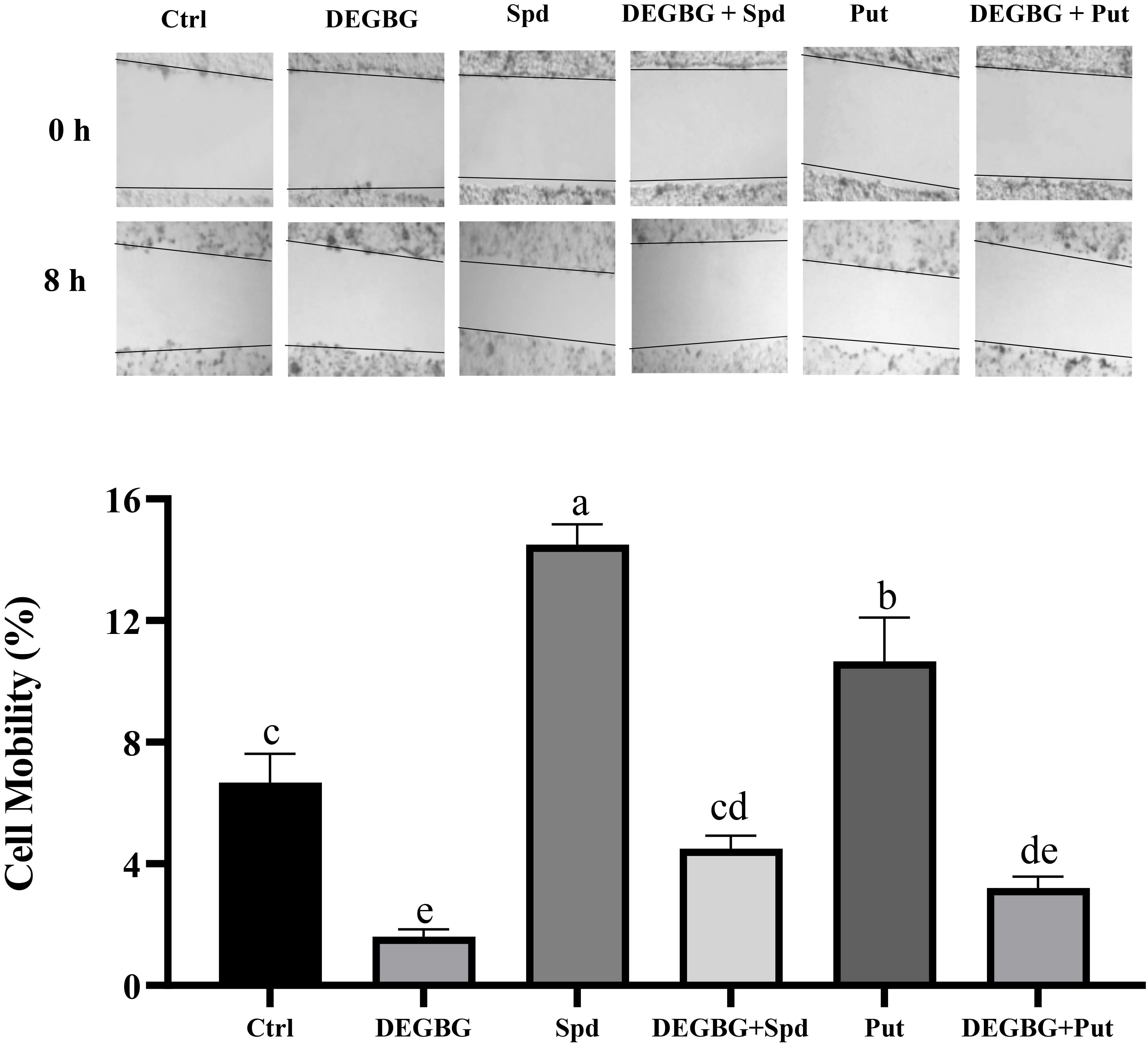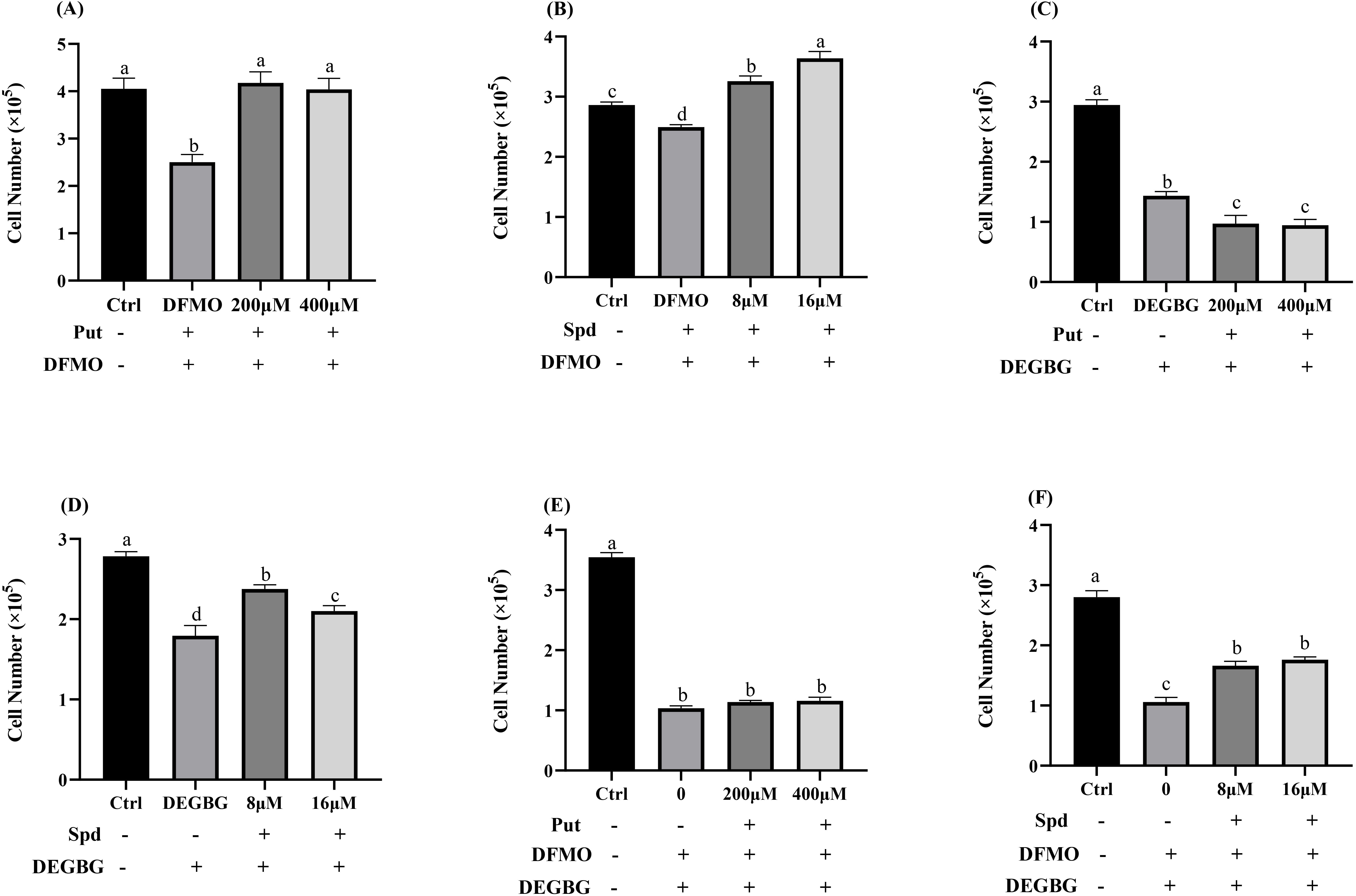 Therefore, the primary purpose of this study is to investigate the effect of spermidine on the proliferation, migration, and inflammatory response of porcine intestinal epithelial cells and to detect the role of spermidine in mediating the physiological functions of putrescine. We hypothesized that the conversion of putrescine into spermidine is essential for putrescine to perform its functions in cell proliferation, migration, and anti-inflammation. Difluoromethyl ornithine (DFMO), an irreversible inhibitor of ODC, can effectively block the synthesis of putrescine from ornithine, and diethylglyoxal bis (guanylhydrazone) (DEGBG), a specific inhibitor of SAMDC, can effectively block the synthesis of spermidine from putrescine and spermine from spermidine. They were used to block the production of putrescine and spermidine in the cells, respectively. Results from this study provided new insights into the mechanism of polyamine function in regulating the inflammatory response of porcine enterocytes.