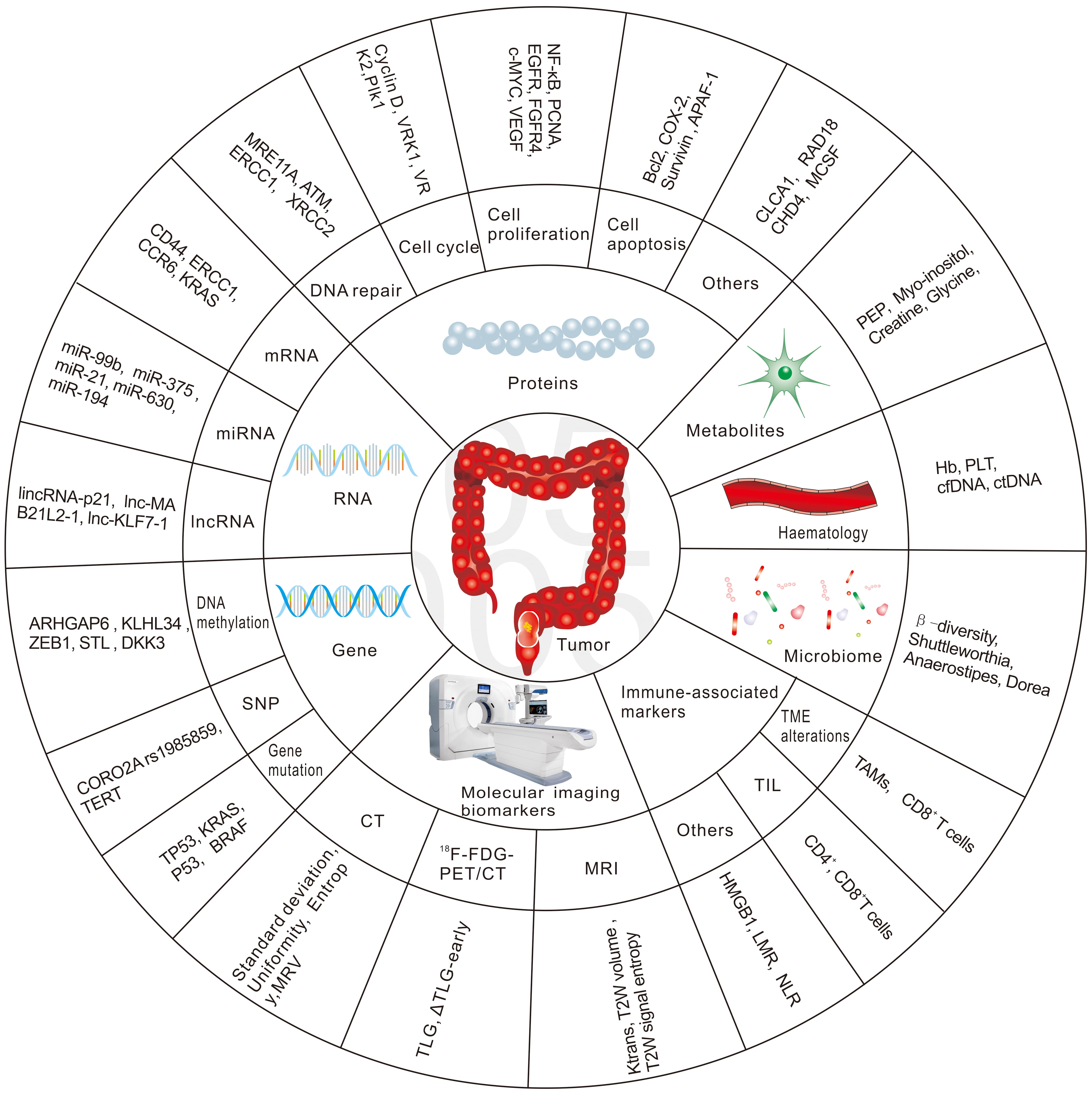 Hence, there is an urgent need to identify biomarkers that predict patient response to nCRT in the early phase, to develop alternative treatment strategies for non-responders and thus reduce the toxicity from ineffective nCRT, and to provide appropriate alternative treatments in a timely manner. The future management of RC patients is likely to be highly individualized, with a more rigorous treatment approach for high-risk patients and more flexible treatment principles for good responders. This review will focus on potential biomarkers to predict the response to radiation-based neoadjuvant therapy in patients with RC. We have summarized the most common biomarkers in Fig. 1.
