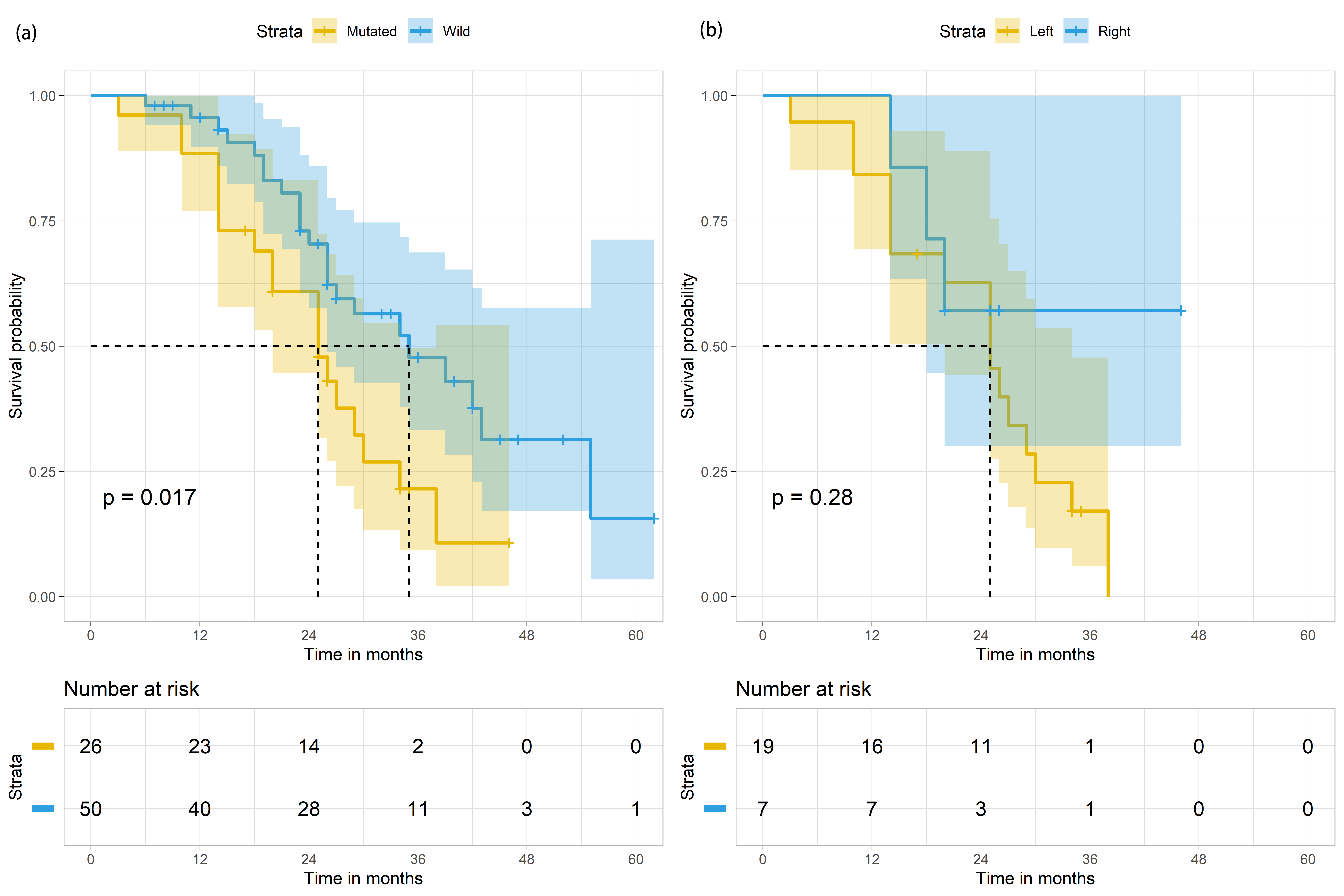 Fig. 3.Survival outcomes of mCRC patients (n = 76) based on KRAS status and based on both KRAS status and primary tumour in the colon. (a) Survival outcomes of mCRC patients (n = 76) based on KRAS status (mutated in yellow; wild in blue). (b) Survival outcomes of mCRC patients with KRAS mutation (n = 26), based on the site of primary tumour in the colon (Left colon in yellow; Right colon in blue). The shaded areas indicate the 95% confidence intervals for each group. Metastatic sites of mCRC patients and their effects on survival periods.