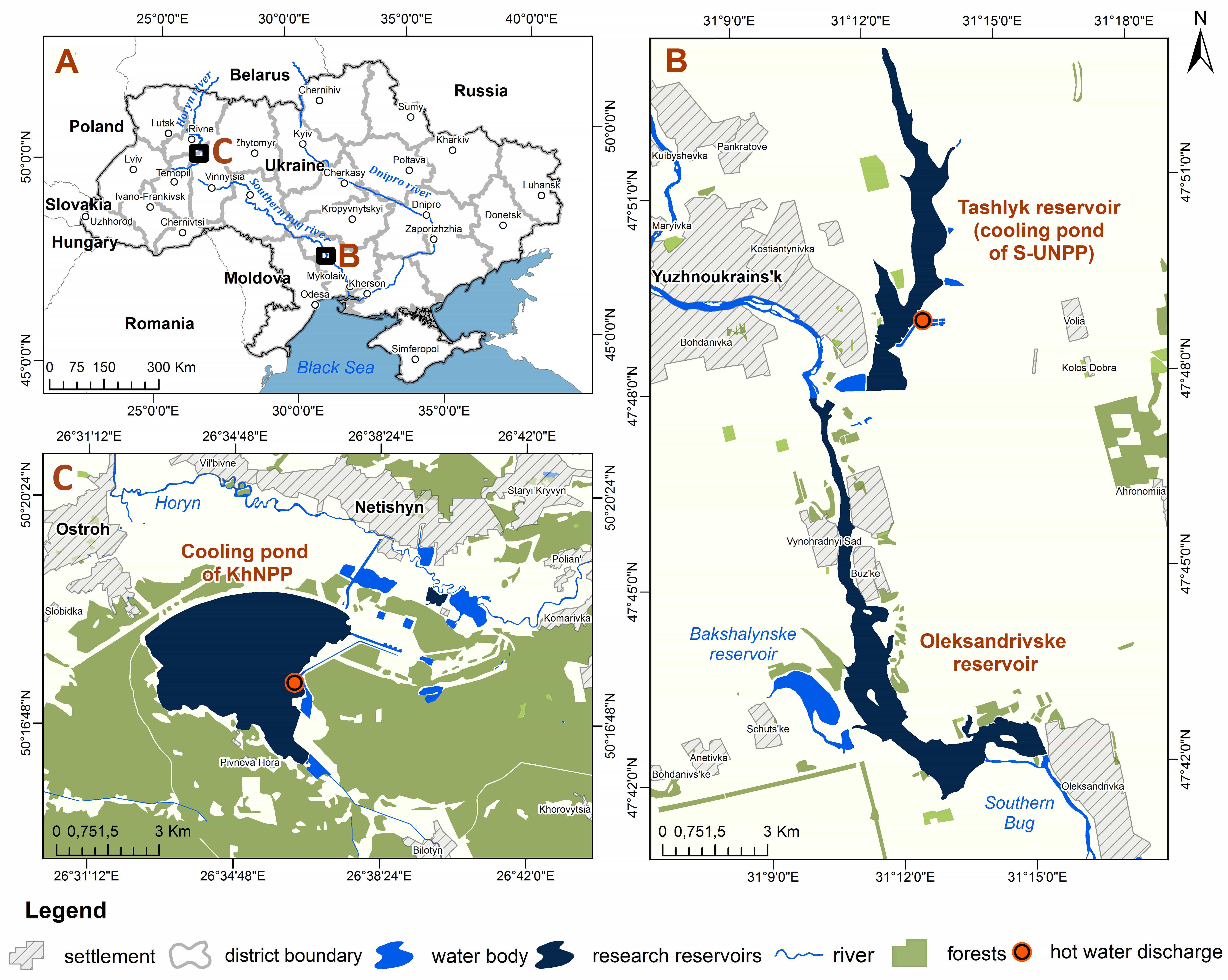 Fig. 1.Location map of study area on the territory of Ukraine. (A) Location of sites B and C on the territory of Ukraine. (B) A cooling reservoir of the Khmelnitsky nuclear power plant (NPP). (C) The Tashlyk and Oleksandrivske reservoirs.