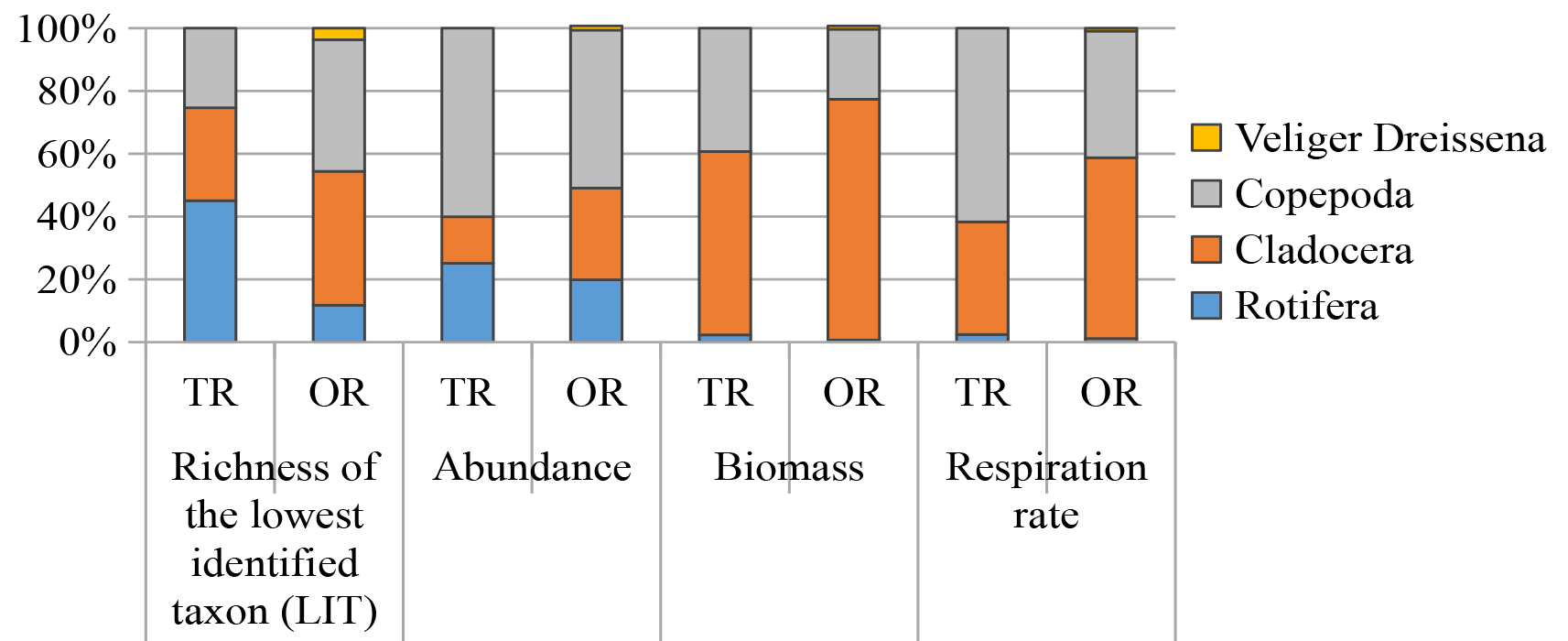 Fig. 10.Ratio of the main zooplankton taxonomic groups in two reservoirs regarding the richness of LIT, abundance, biomass, and destruction (Respiration rate). TR, Tashlyk reservoir; OR, Oleksandrivske reservoir (July 2018).