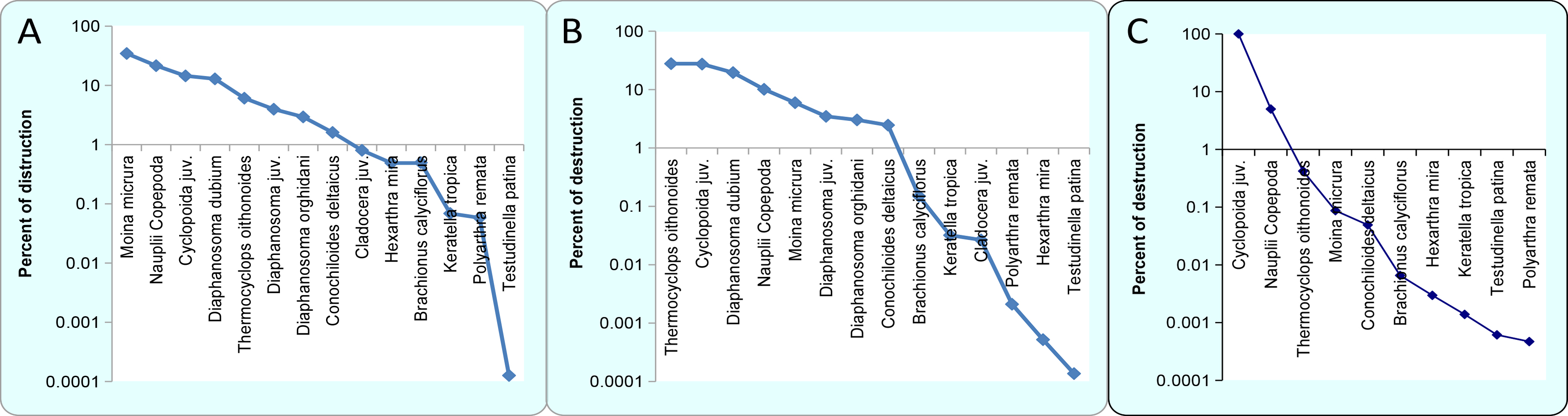 Fig. 11.Graph of dominance–diversity of zooplankton communities in the Tashlyk reservoir. Illustration (A) community Moina micrura + Nauplii, (B) Thermocyclops oithonoides + Cyclopoida juv. + Diaphanosoma dubium, and (C) Cyclopoida juv.