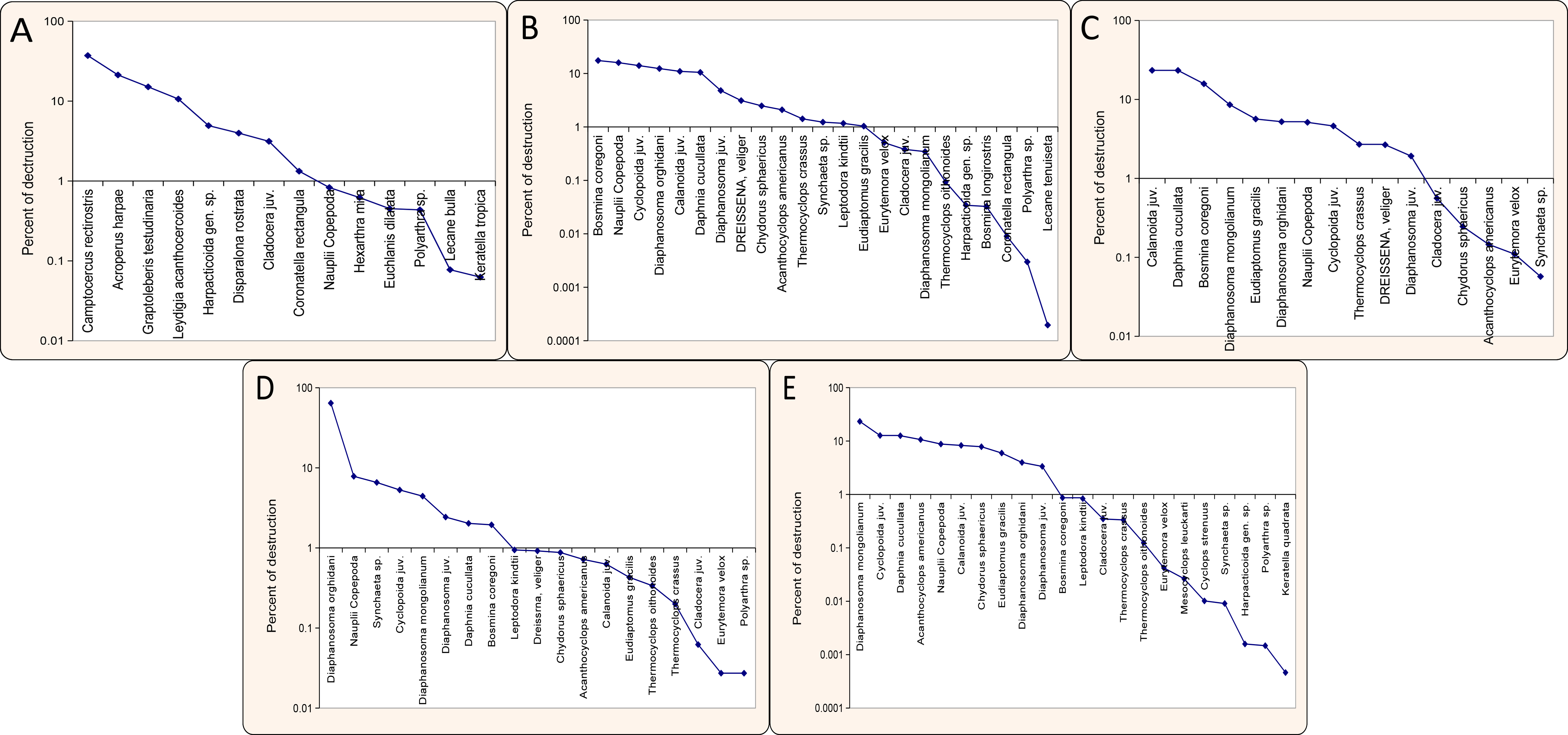 Fig. 12.Graph of dominance–diversity of zooplankton communities in the Oleksandrivske reservoir. Illustration (A) community Camptocercus rectirostris + Acroperus harpae, (B) Bosmina coregoni + Nauplii + Cyclopoida juv. + Diaphanosoma orghidani, (C) Calanoida juv.+ Daphnia cucullata + Bosmina coregoni, (D) Diaphanosoma orghidani, and (E) Diaphanosoma mongolianum + Cyclopoida juv. + Daphnia cucullata.