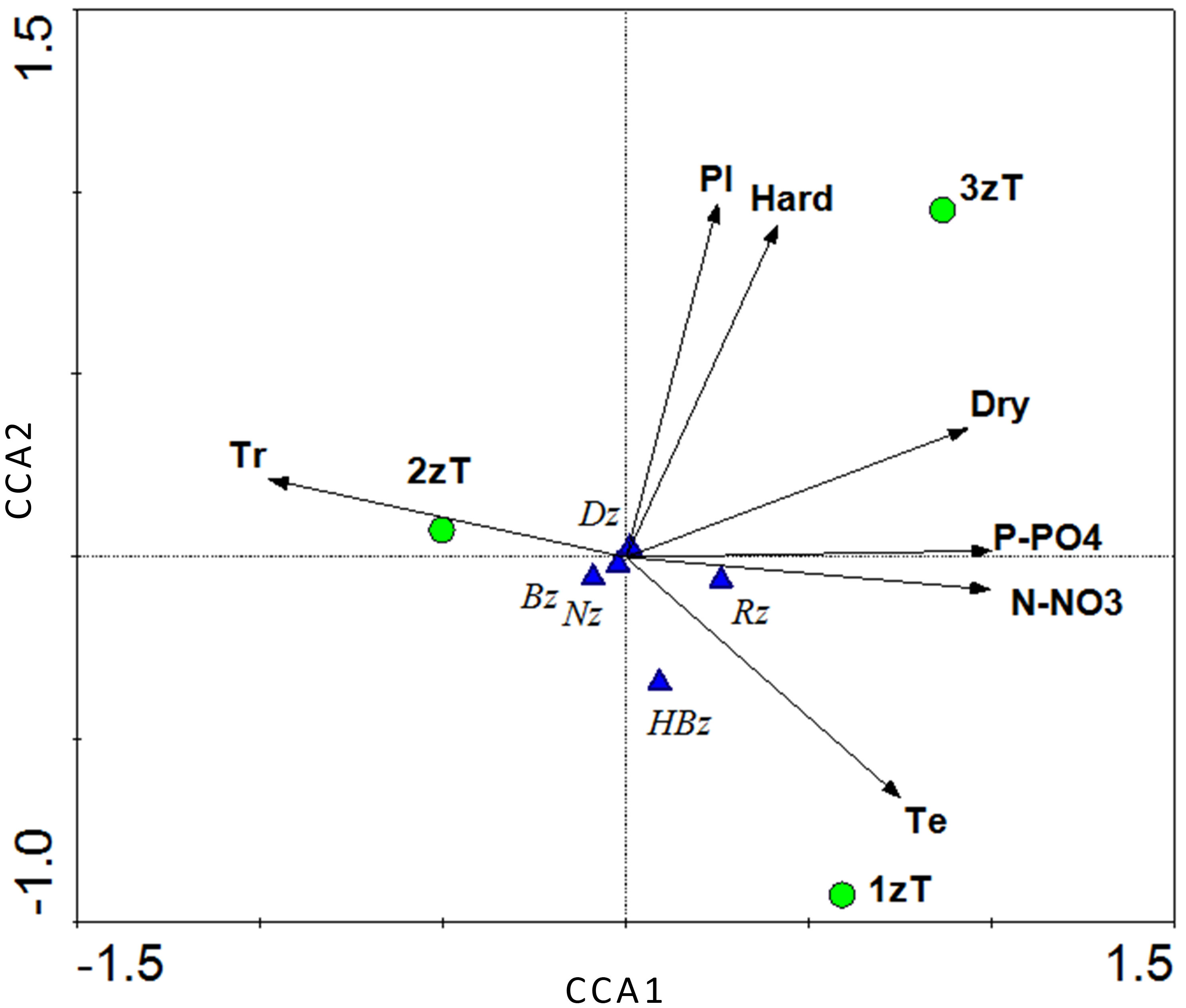 For the 1zT zooplankton community (Fig. 14) (Moina micrura + Nauplii), the temperature factor was the significant factor. For the second (2zT) (Thermocyclops oithonoides + Cyclopoida juv. + Diaphanosoma dubium), water transparency was the significant factor. Salinity and organic matter content were significant for the third community (3zT), which was dominated by Cyclopoida juv. At the same time, the indicators of the structure of communities were not significantly associated with indicators of environmental conditions, these indicators were similar in the middle of the plot.