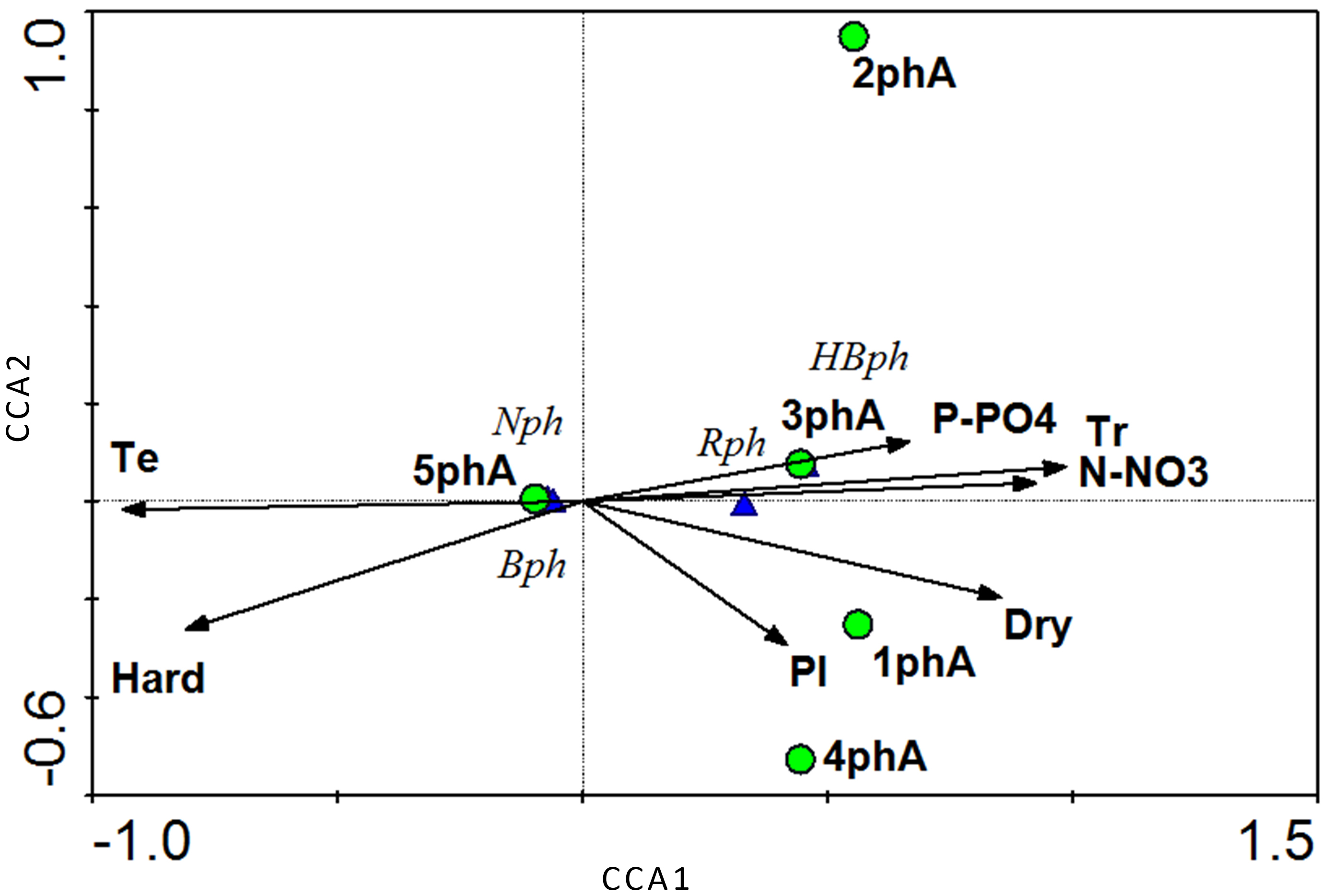 In the Tashlyk reservoir both phyto- and zooplankton communities (Figs. 13,14) were very original and peculiar, this is especially significant for phytocommunities. For the phytoplankton community (Fig. 13) Scenedesmus magnus + Cosmarium sp. + Nitzschia kuetzingiana (1phT), the most significant factors were temperature and the content of organic matter and phosphorus of phosphates. The second (2phT) (Cosmarium sp. + Scenedesmus magnus + Nitzschia kuetzingiana) had salinity, and (3phT) the third, (Binuclearia lauterbornii + Cosmarium sp. + Rhodomonas pusilla) had nitrate nitrogenn and transparency.