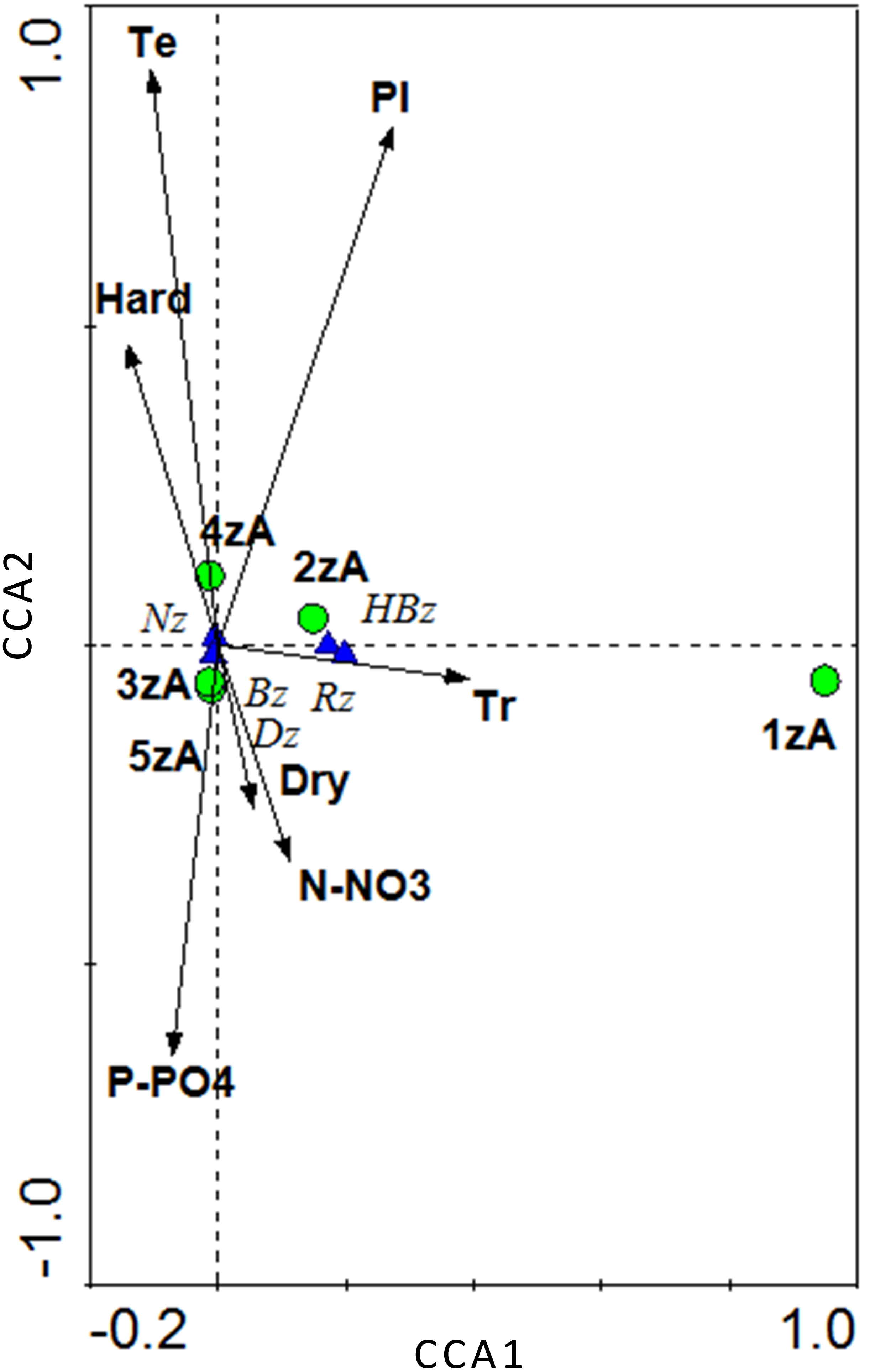 Among the zooplankton communities (Fig. 16) in the Oleksandrivske reservoir, the 1zA community (Camptocercus rectirostris + Acroperus harpae) can be considered the most original. Of all the factors, the most significant for him was the transparency of the water. This community was localized at the top river-like part of the reservoir. It was distinguished by very small indices of abundance and biomass, with a rather large wealth of LITs. The rest of the communities were quite similar in terms of their structural indicators. At the same time, the indicators of the structure of communities were not significantly associated with indicators of environmental conditions, they were close to the middle part of the plot.