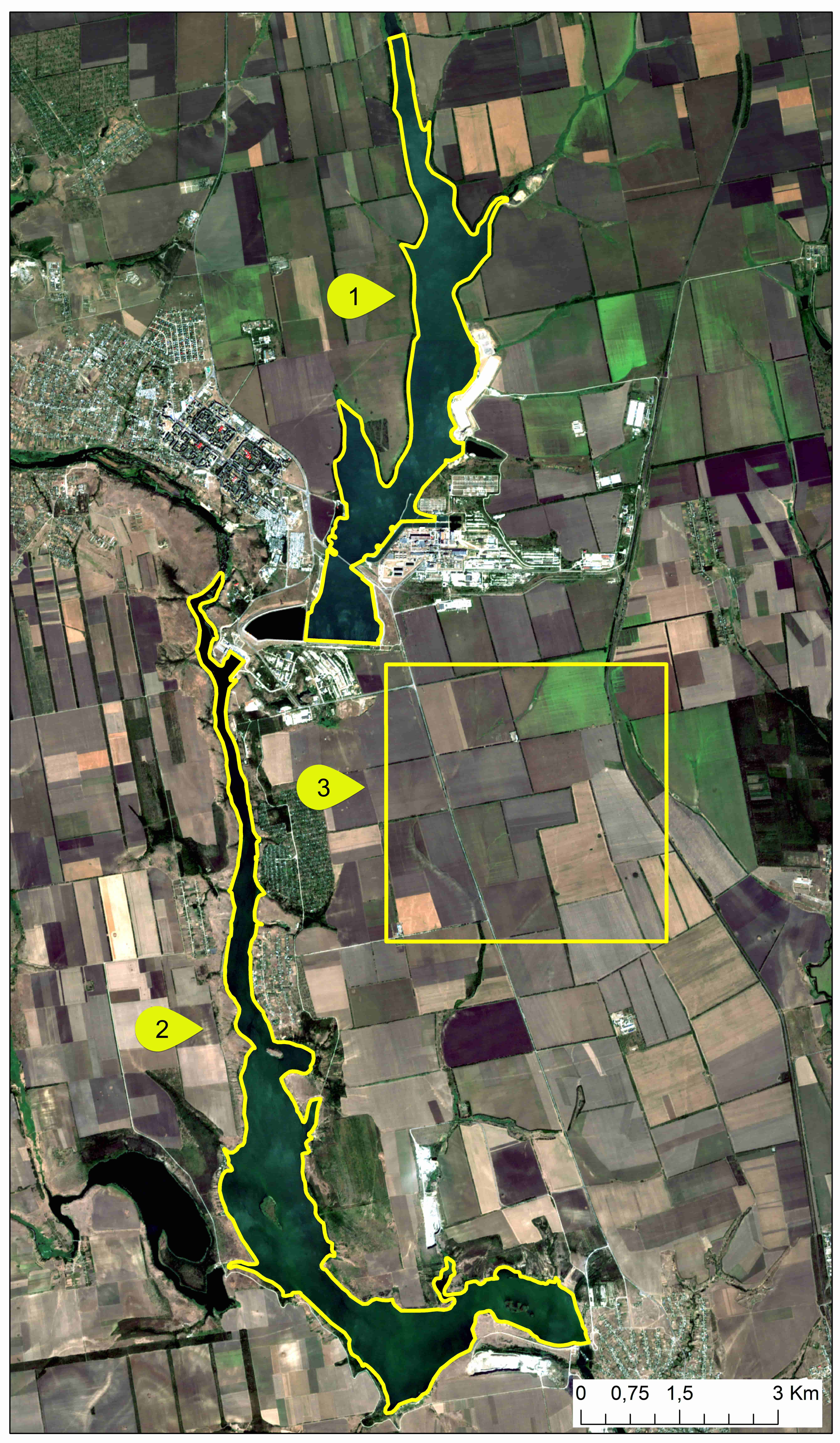 Fig. 17.Objects on the Earth’s surface, within the boundaries of which the average temperatures were measured. 1, Tashlyk reservoir; 2, Oleksandrivske reservoir; 3, land polygon.