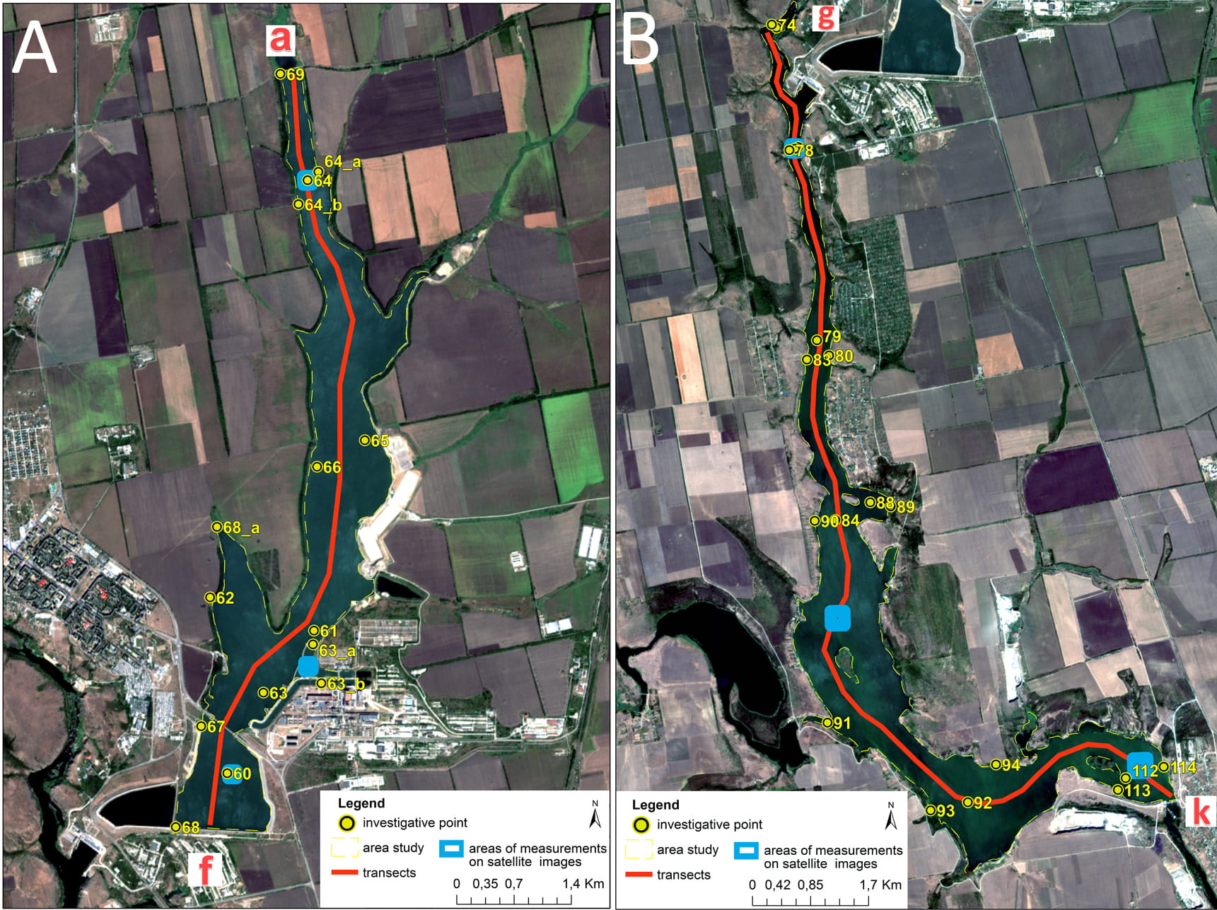 Fig. 2.Location of study stations (A) the Tashlyk reservoir, and (B) Oleksandrivske reservoir. The location of transects of (a–f) the Tashlyk reservoir, and (g–k) the Oleksandrivske reservoir on satellite image Sentinel-2 (for 30.08.2020).