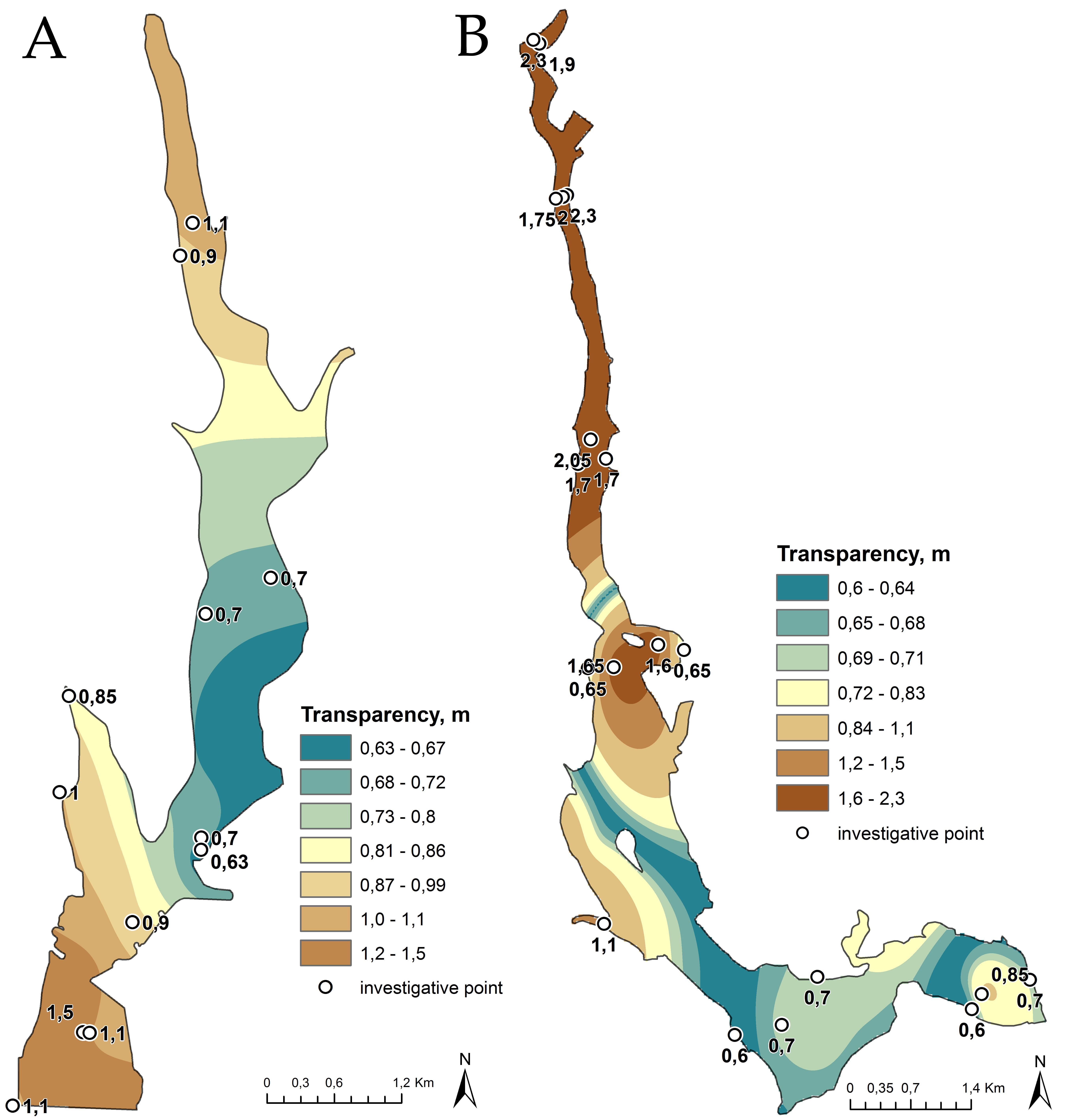The distribution of temperature and transparency illustrated in Fig. 6. The distribution of temperature on transects shows two main differences in thermal regime. The difference in temperature is significant, whereas temperature in the Oleksandrivske reservoir is rather monotonous. However, in the middle part of Tashlyk, where area of heated water discharge, a certain increase in temperature is noticeable. Transparency shows a mirror image with temperature along the transect. For the Oleksandrivske reservoir, both variables are divided into two groups, dividing the transect almost in half (about 7 km south of the beginning of the transect). Transparency differed in these zones (g–i and j–k) by almost four times.