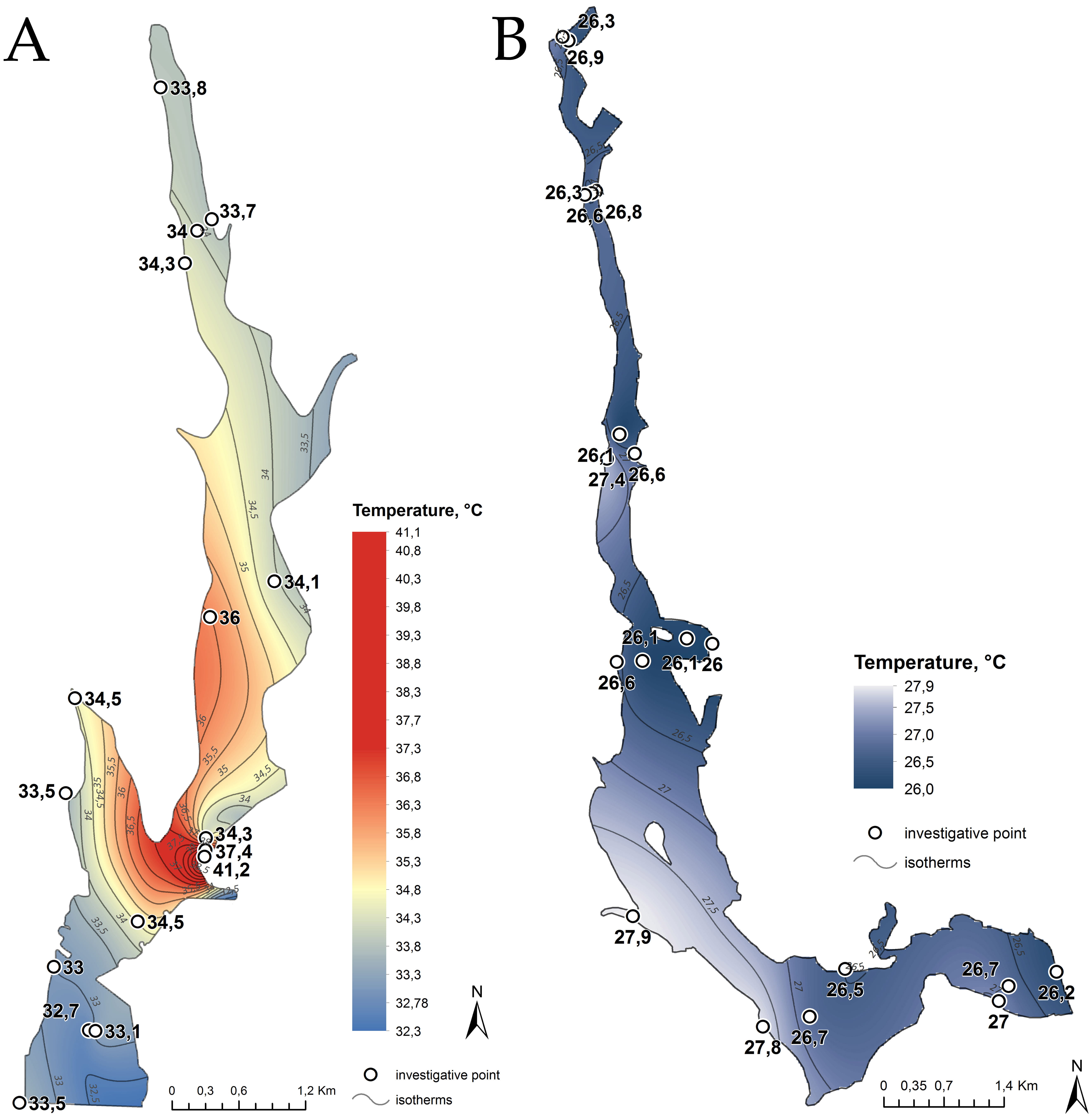 If we differ the fundamental differences between the two studied water bodies, then the following should be pointed out: differences in the nature of the thermal regime and differences in the general hydrodynamics of waters [4]. Oleksandrivske reservoir is a typical reservoir on a middle river in which flow rates gradually decrease towards the dam, depth increases, sediments accumulate, based on the needs of water use, water flow from the reservoir can increase, however, basically there is a certain balance of inflow and outflow, water temperature at surface is practically unchanged throughout the water area. The Tashlyk reservoir has no flow through the dam; its natural replenishment due to a very small river is insignificant, the replenishment of water, a significant part of which evaporates, occurs due to pumping from the Southern Bug River. The so-called “internal water exchange”, that is, the ratio of the circulating waters of the nuclear power plant and the volume of the reservoir is very high: a volume of water equal to the volume of the entire reservoir could pass through the cooling systems, with the constant operation of three power units more than 90 times a year. Deep-water intake contributes to the mixing of the water mass, so heated, but oxygen-rich waters can move into the depths. In the reservoir, the water temperature is much higher than in the Oleksandrivske reservoir, in addition, there are significant differences in the water temperature in the reservoir itself.