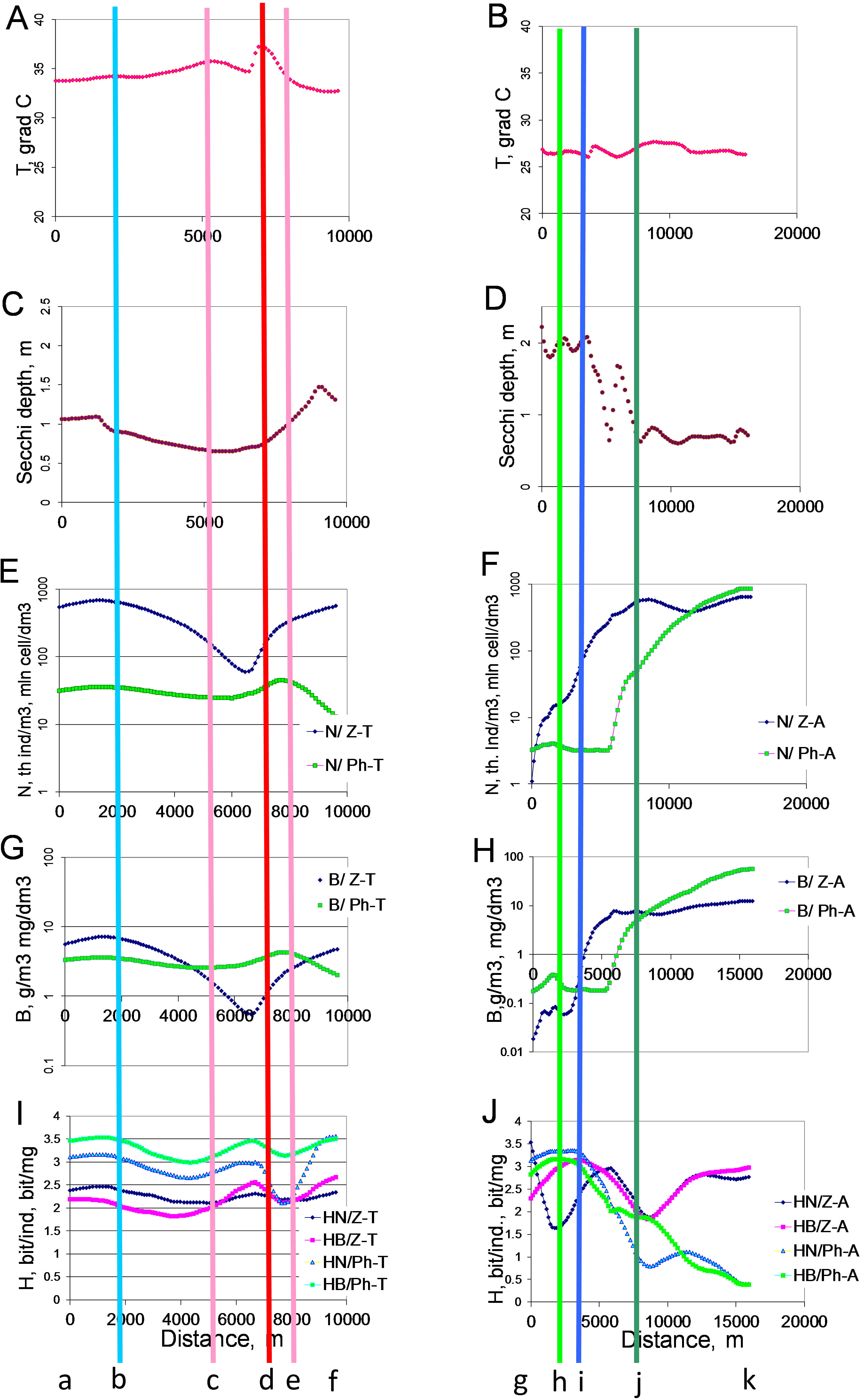 Fig. 6.Changes of hydrobiological variables along transects (a-f, see Fig. 2A) in the Tashlyk reservoir and Oleksandrivske reservoir (g-k, see Fig. 2B). Changes of temperature along transects in the Tashlyk reservoir (A) and Oleksandrivske reservoir (B); the Secchi depth value in the Tashlyk reservoir (C) and Oleksandrivske reservoir (D); the abundance of phyto- and zooplankton in the Tashlyk (E) and Oleksandrivske (F) reservoirs, the biomass of phyto- and zooplankton along transects in the Tashlyk (G) and Oleksandrivske (H) reservoirs; the diversity indices by abundance and biomass of phyto- and zooplankton along transects in the Tashlyk (I) and Oleksandrivske (J) reservoirs. Colored lines for the Tashlyk reservoir (a, b, c, d, e, f) and for Oleksandrivske reservoir (g, h, i, j, k) show the characteristic sections of each transect, explained in the text.