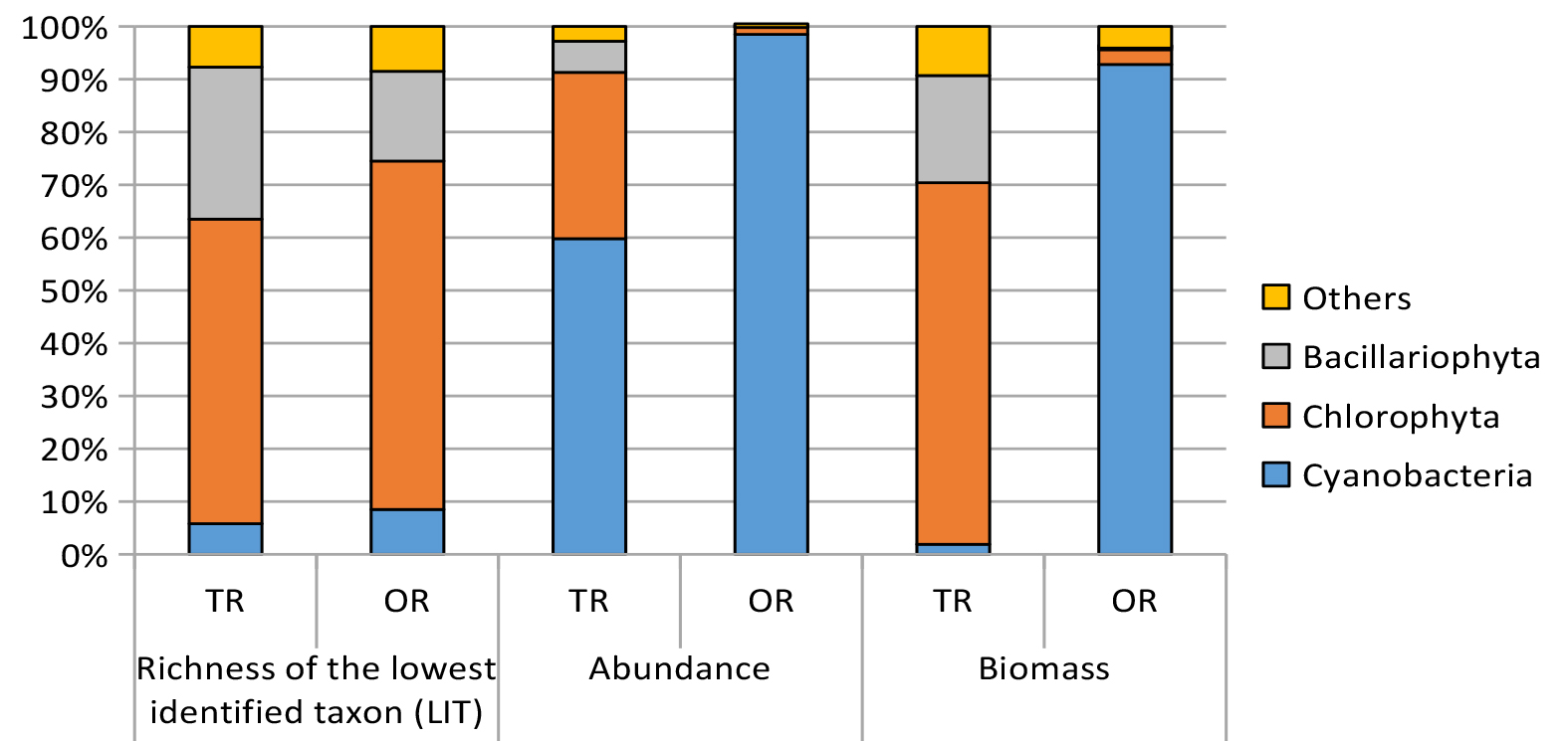 Fig. 7.Ratio of main phytoplankton phyla in two reservoirs represented as richness of LIT, abundance, and biomass. Note: TR, the Tashlyk reservoir; OR, the Oleksandrivske reservoir respectively in July 2018.