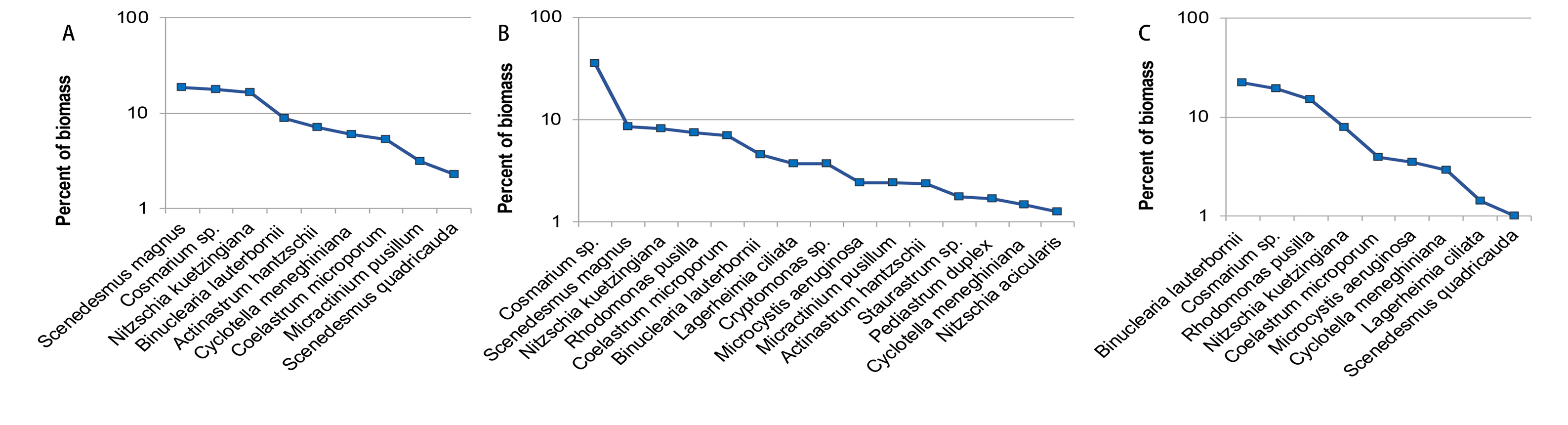 Fig. 8.The graph of dominance–diversity of phytoplankton communities in the Tashlyk reservoir. Illustration (A) community Scenedesmus magnus + Cosmarium sp. + Nitzschia kuetzingiana, (B) Cosmarium sp. + Scenedesmus magnus + Nitzschia kuetzingiana, and (C) Binuclearia lauterbornii + Cosmarium sp. + Rhodomonas pusilla.
