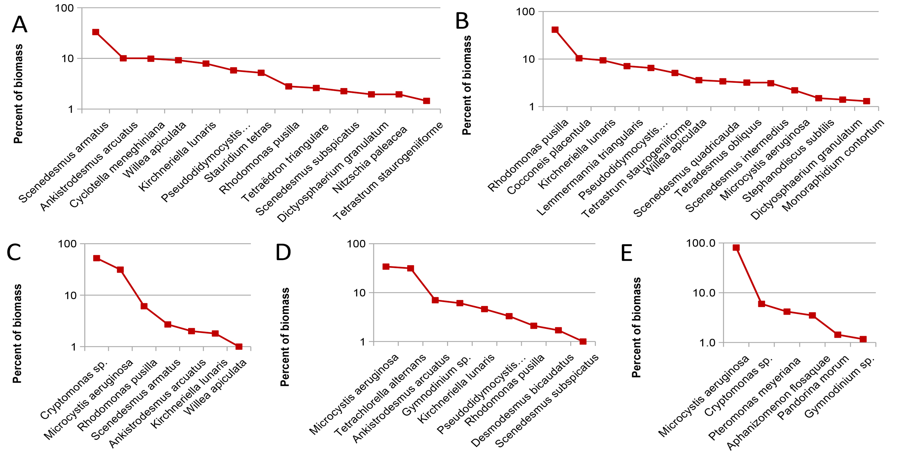 Fig. 9.Graph of dominance–diversity of phytoplankton communities in the Oleksandrivske reservoir. Illustration (A) community Scenedesmus armatus + Ankistrodesmus arcuatus + Cyclotella meneghiniana, (B) Rhodomonas pusilla + Cocconeis placentula, (C) Cryptomonas sp., (D) Microcystis aeruginosa + Tetrachlorella alternans, and (E) Microcystis aeruginosa.