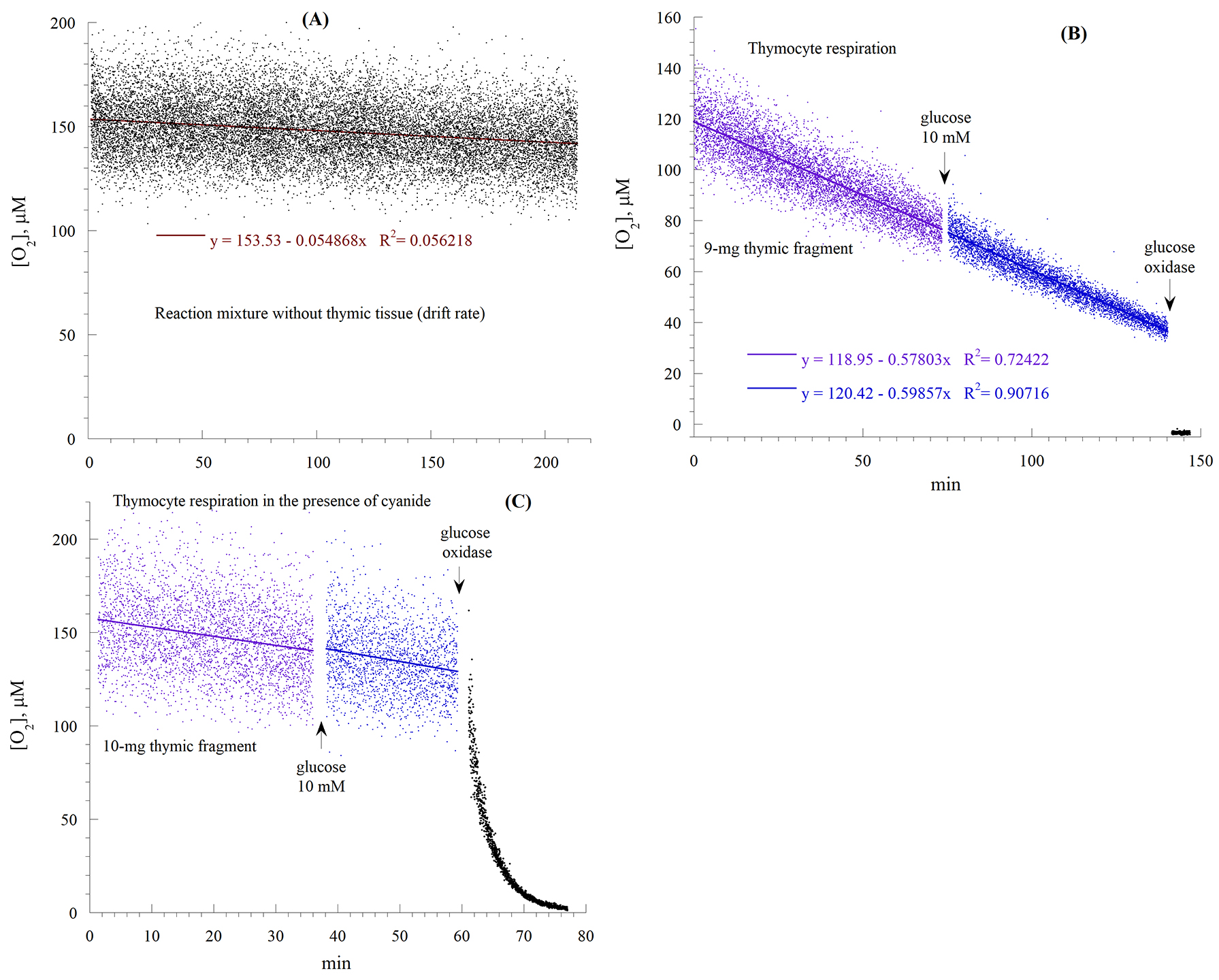 It is worth noting that the high noise at the start of runs (air-saturated solutions) reflects the diminutive phosphorescence that reaches the photomultiplier tube (PMT), as dissolved oxygen quenches the light. By contrast, the low noise at the end of runs (oxygen-depleted solutions) reflects the augmentative phosphorescence that reaches the PMT. It is important, however, to realize that this phenomenon does not affect an accurate determination of the rate when a thymic fragment is present.