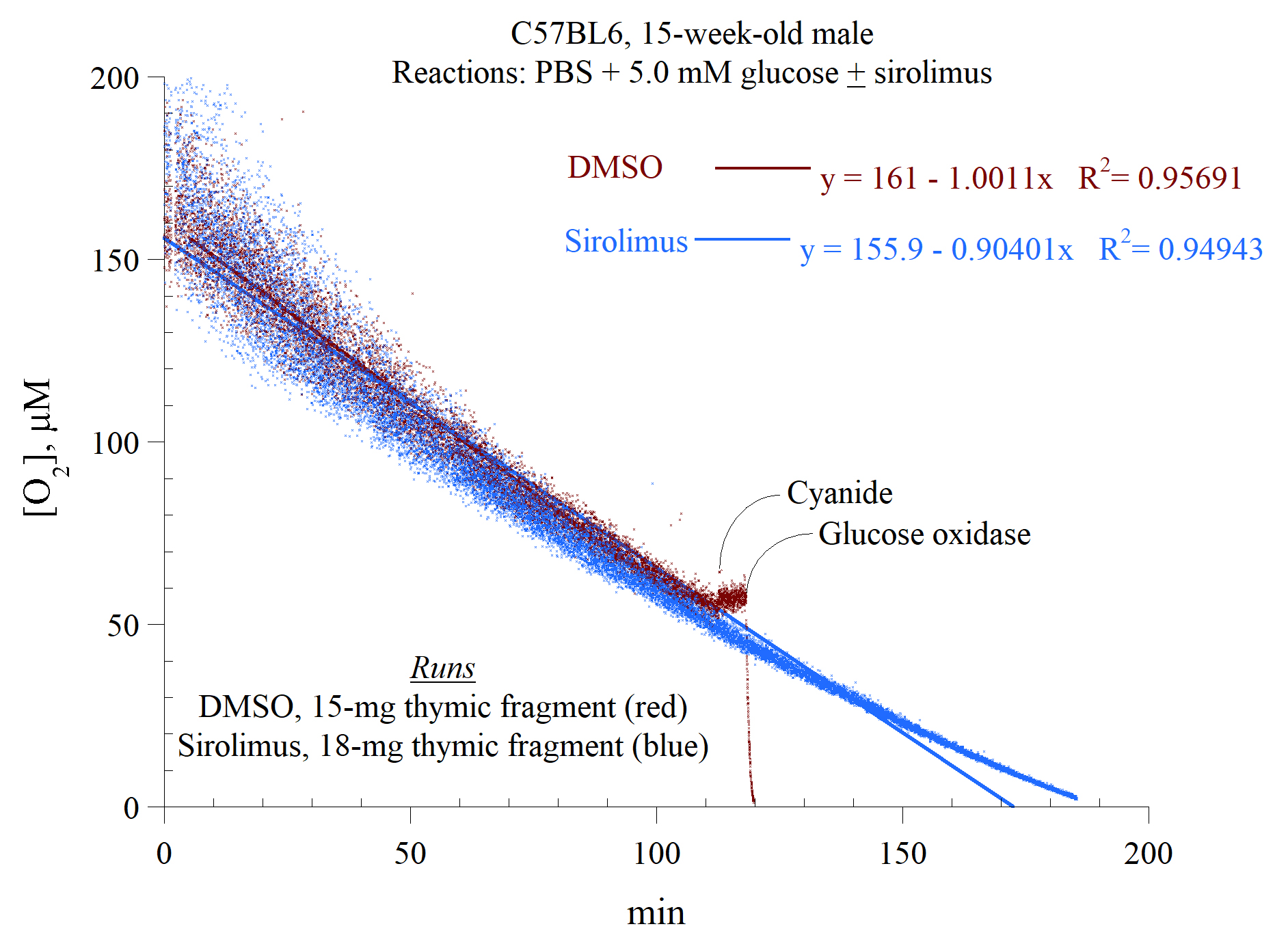 The term ‘cellular respiration’ infers to the reactions that result in oxygen reduction in cytochrome oxidase, which is the main metabolic pathway that drives ATP synthesis. Thus, mitochondrial respiration provides insight into cellular function on the whole. In this report, we describe the use of our phosphorescence oxygen analyzer to measure cellular mitochondrial respiration in thymic fragments from mice (referred to as, ‘thymocyte respiration’) [4]. This technique was recently used to investigate various animal models of human diseases [5, 6, 7], and it can be applied to investigate the thymus. The method allows measuring the direct effect of compounds, such as immunosuppressants (e.g., sirolimus) on thymocyte respiration [8, 9]. It also allows such measurements after in vivo treatments of animals with a specific immunomodulator (e.g., ozanimod). Both types of experiments are reported in this study as examples.