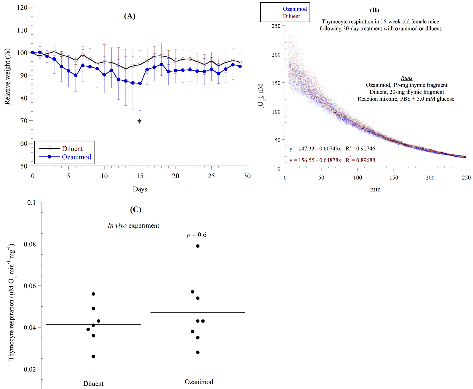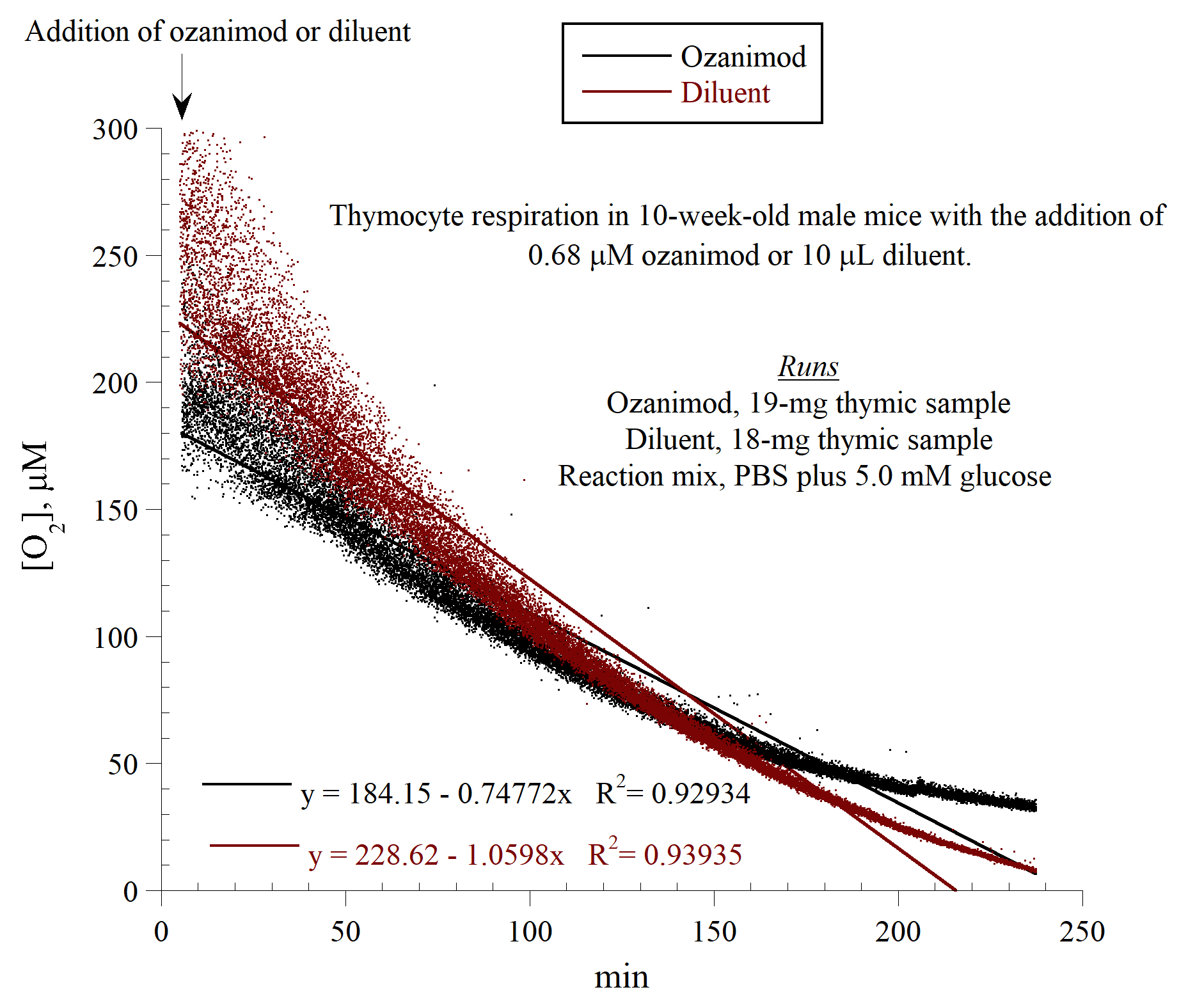 We show here that the phosphorescence oxygen analyzer can be used to monitor thymocyte respiration in the presence of immunotoxins, or following an in vivo treatment with such compounds. This technique has been used previously in various tissues and with various types of compounds [4, 5, 6, 7, 9, 17, 18], but this is the first report of studying the effects of an agonist of the sphingosine 1-phosphate receptors (ozanimod) on the thymus.
