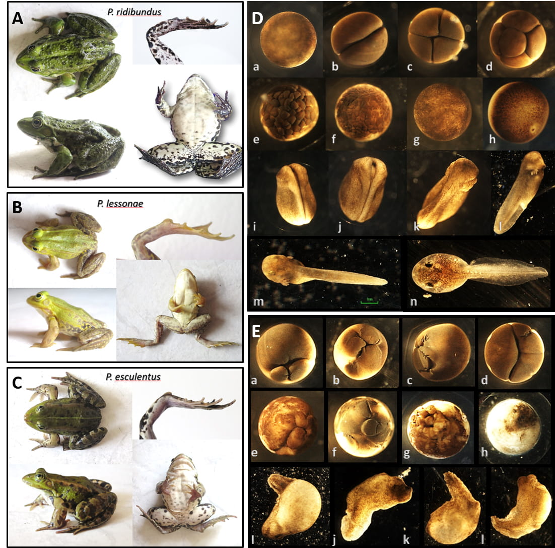 For this post-zygotic selection, endogenous genetic mechanisms based on the occurrence of two different genomes from parents may impact early development survival rates [10]. Knowing these mechanisms would help us understand the origin and maintenance of animal systems in which hybrid asexual fish and amphibians live in sympatry with a sexual species. These animal systems are known to have dynamic reproduction in which various gametes are formed, and various genotypes originate [11, 12]. Most of them are, however, unfit. To reproduce, hybrids have to get a sexual gamete to trigger embryonic development from clonal diploid eggs (gynogenesis) or to reach a zygote through fertilization with a clonal haploid gamete referred to as hybridogenetic hemiclonal reproduction [13]. A study of larval development showed post-zygotic selection against parental genotypes to maintain all-hybrid populations of the frog Pelophylax esculentus [10]. Thus, opportunities to study the early stages of taxa forming sexual-asexual systems under controlled conditions may help us understand the possible influence of embryonic and larval variation development on the dynamics of a mixed population structure.