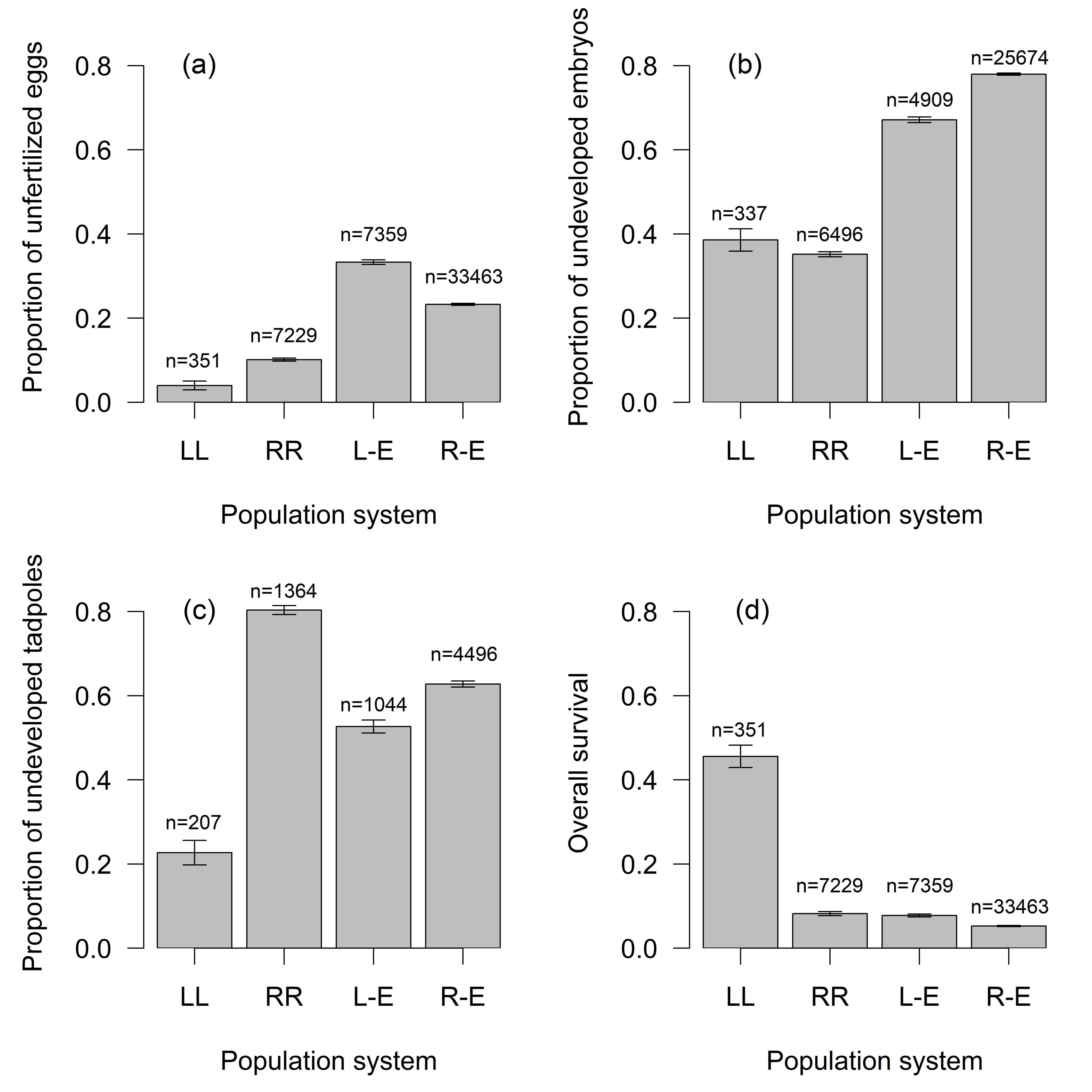 L-E crosses: Embryonic survival rates differed significantly in families with P. esculentus backcrossed to P. lessonae. Lower EM (35.4%) was observed in progeny mothered by hybrid females than in progeny fathered by hybrid males (EM 79.2%), see Supplementary Table 6, while tadpole mortality was similar (75.5/79.7%). Hybrid x hybrid crosses (resulting in RR progeny) showed extreme mortality rates (EM 99.1%, TM 100%), see Fig. 2, Supplementary Fig. 4.