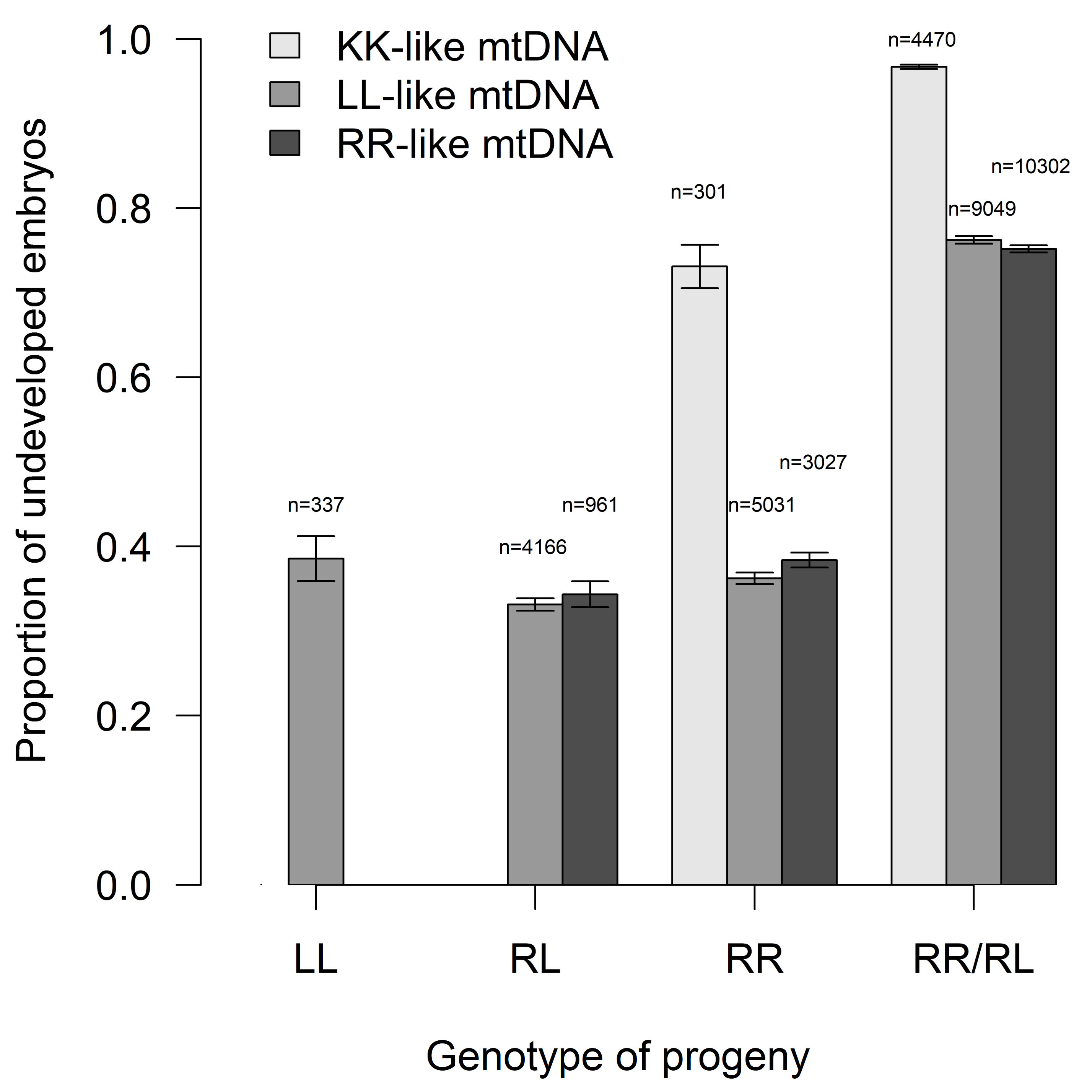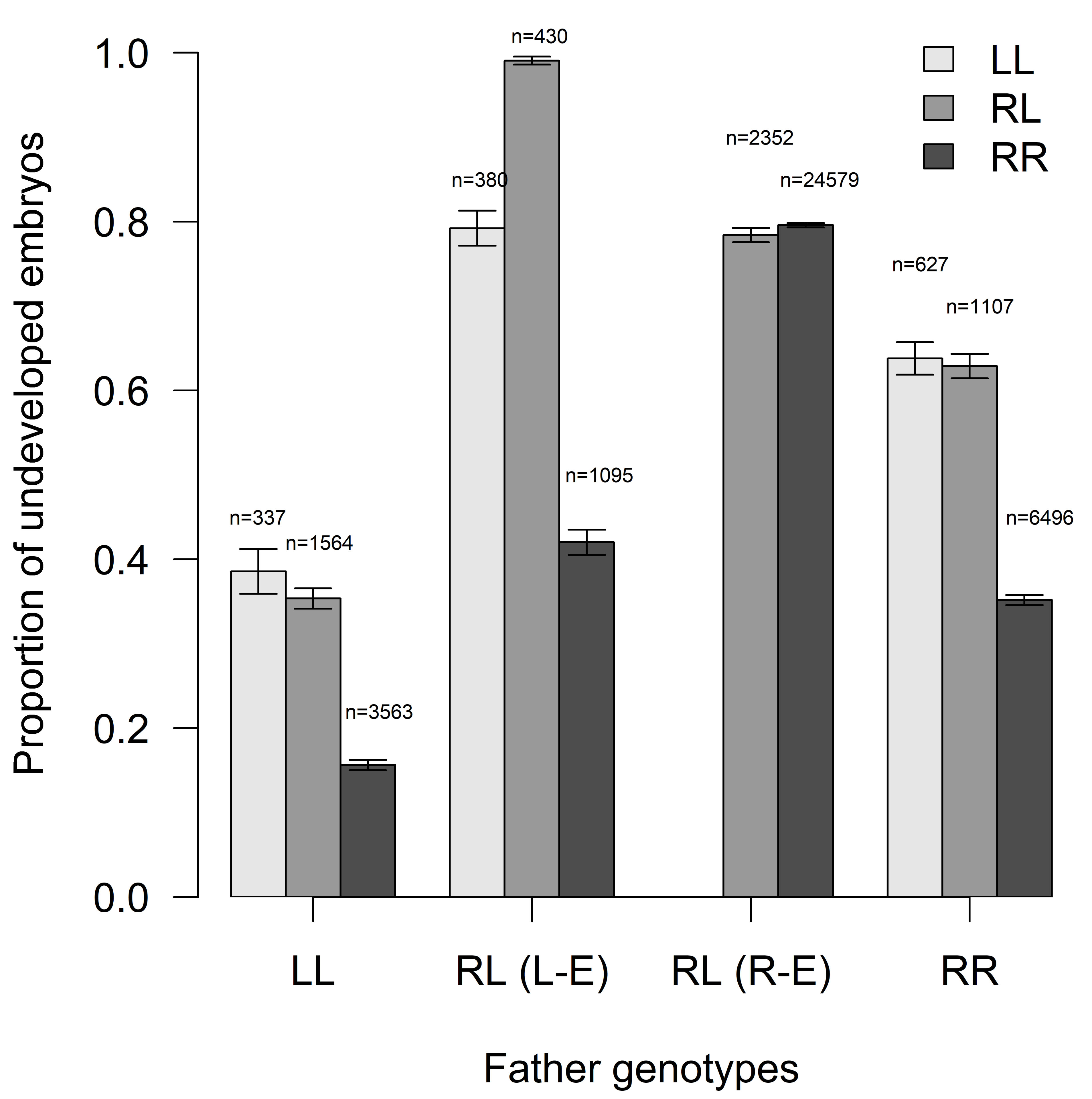 Fig. 4.Proportion of undeveloped embryos concerning their genotype and