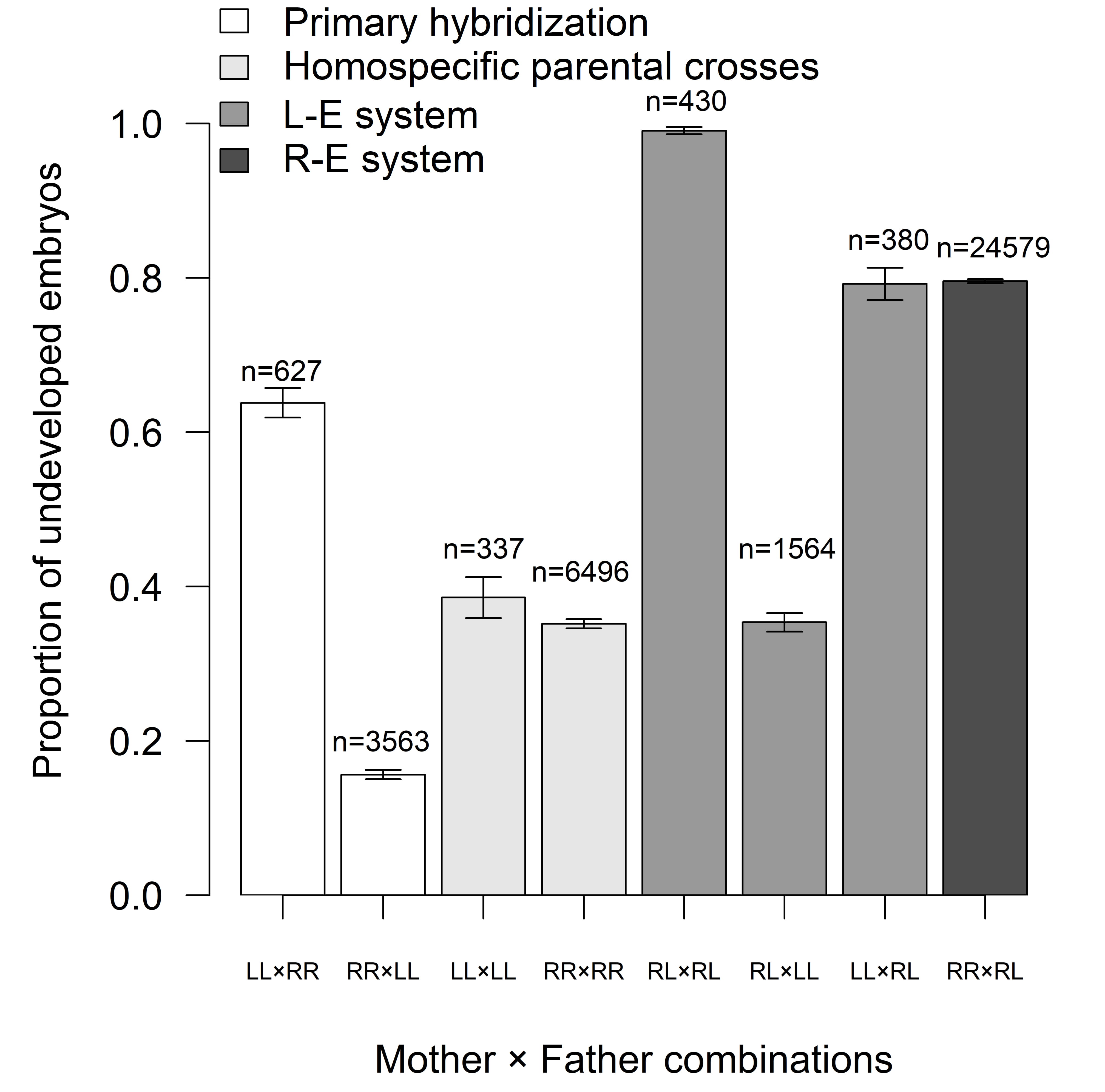 Fig. 5.Proportion of undeveloped embryos in relation to mother x father
