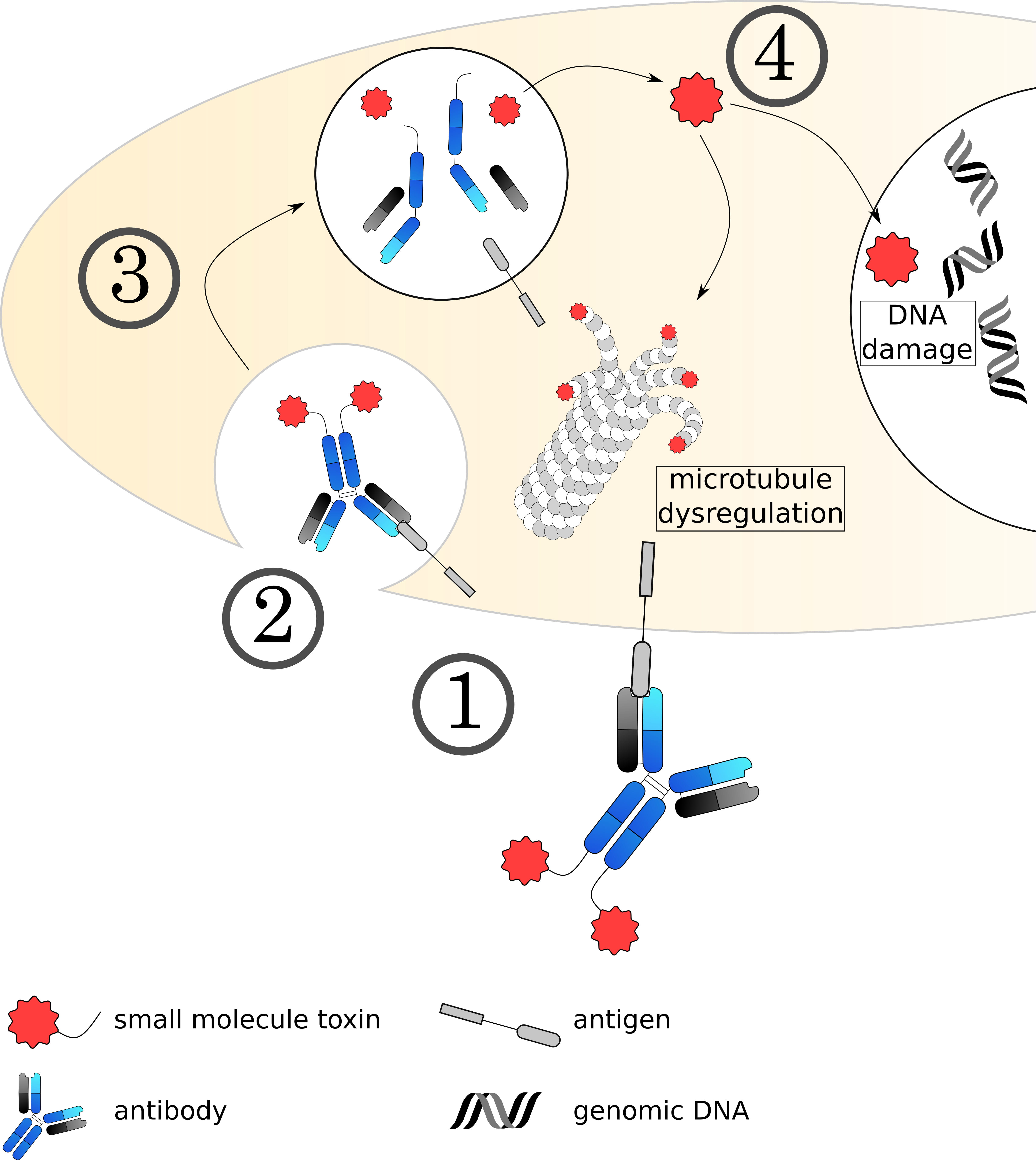 Fig. 5.Mechanisms of small molecule toxin ADCs. (1) The ADC binds to its target on the cell surface via the antibody, followed by (2) internalization of the complex. (3) The early endosome acidifies, matures and fuses with a lysosome. (4) The acidic, protease rich environment leads to a breakdown of the ADC, releasing the toxin to the cytoplasm. Currently used toxins induce cell death usually by dysregulating microtubule formation or damaging the DNA.
