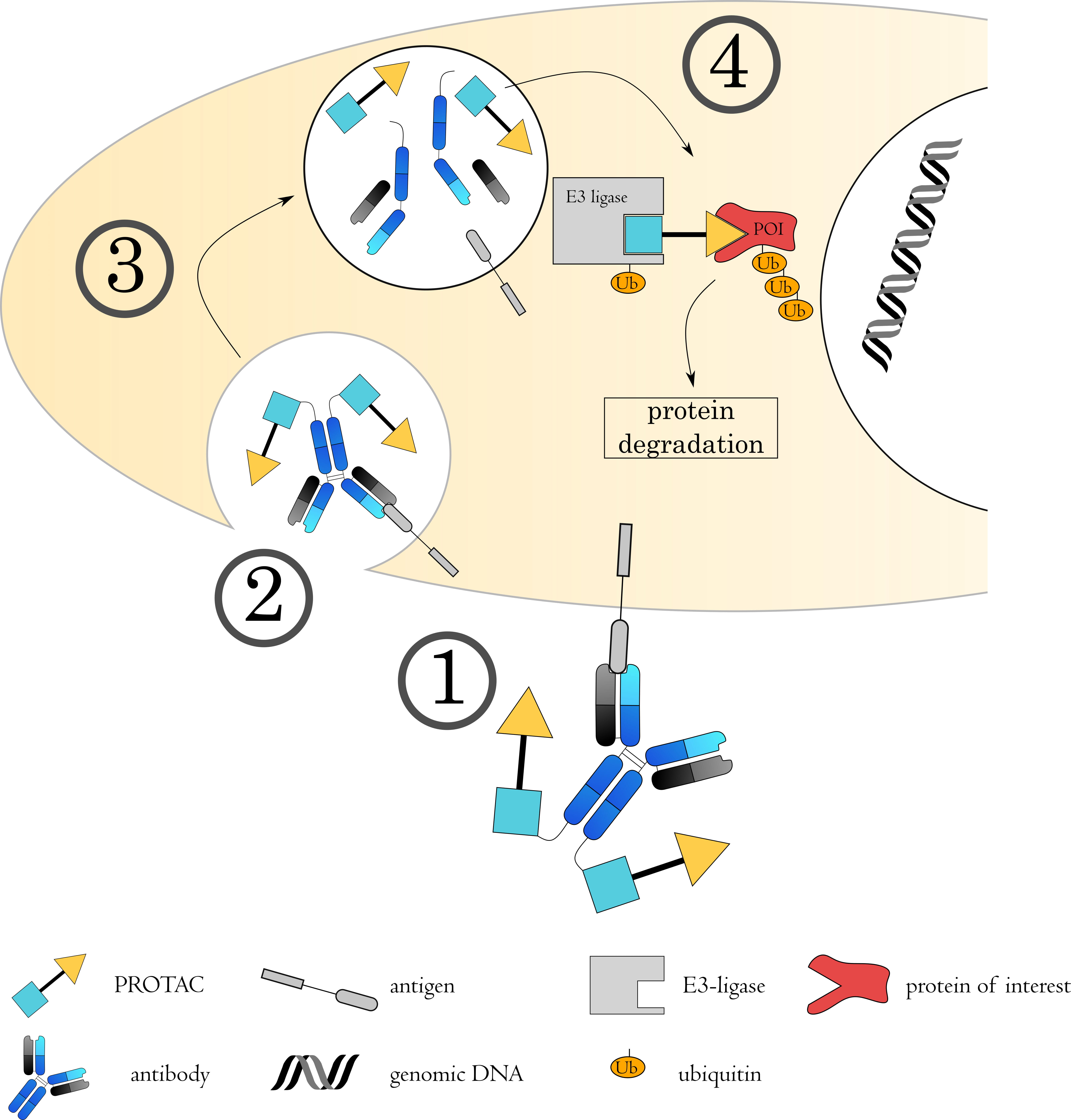 Fig. 7.Mechanisms of Antibody-PROTAC conjugates. (1) The antibody-PROTAC conjugate binds to its target on the cell surface via the antibody, followed by (2) internalization of the complex. (3) The early endosome acidifies, matures and fuses with a lysosome. (4) The acidic, protease rich environment leads to a breakdown of the ADC, releasing the toxin to the cytoplasm. Here, the PROTAC binds to both the protein of interest (POI) as well as an E3 ubiquitin ligase. This spatial proximity induces ubiquitin transfer to the POI, from where it will be targeted to the proteasome for degradation.