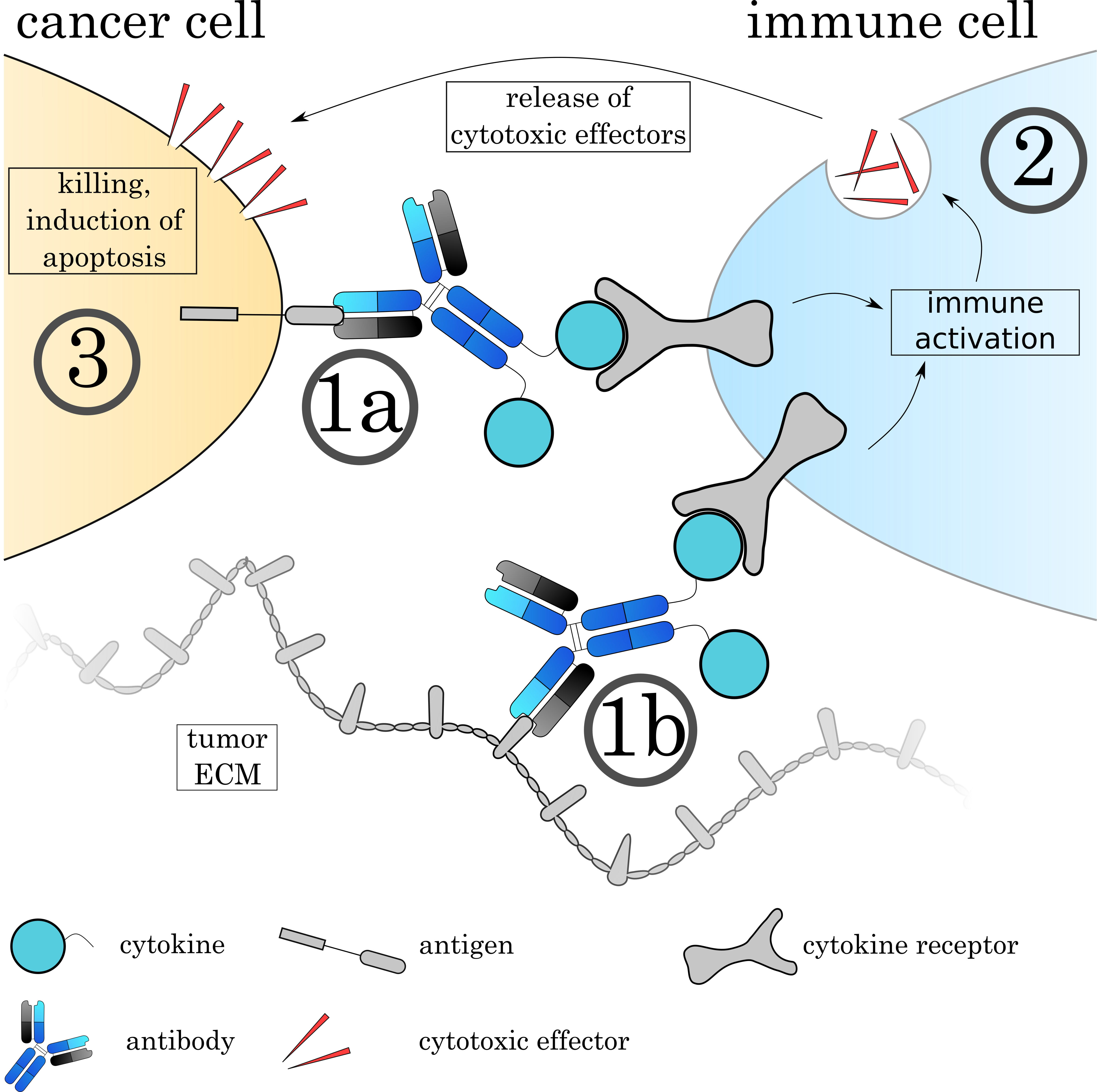 Fig. 9.Mechanisms of Immunocytokines. The Immunocytokine binds to its target either on the cell surface (1a) or on the tumoral extracellular matrix (1b) via the antibody. (2) Immune cells recognize the attached cytokine via their respective cytokine receptor, leading to activation of the cell. The effect varies depending on the cytokine and immune cell. (3) Many immune cells such as cytotoxic T cells and natural killer cells release cytotoxic agents to induce apoptosis on the target cell.