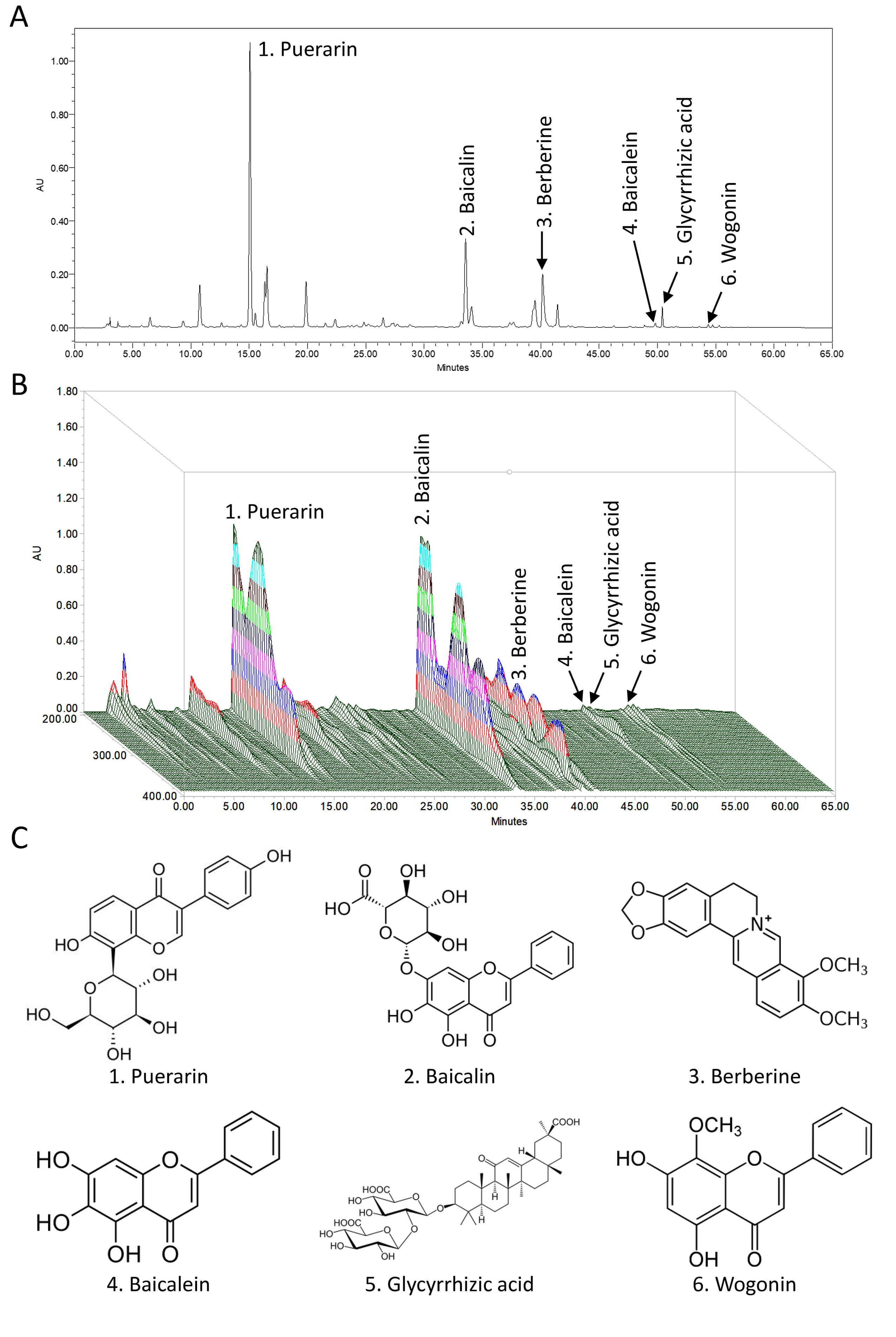 Fig. 1.Ger-Gen-Chyn-Lian-Tang (GGCLT) chromatogram determined by HPLC-UV. The panel shows the fingerprint of the HPLC fingerprint (detection wavelength 250 nm) (A) and three-dimensional structures of these six main index components (B). Structures of the compounds identified by HPLC-UV (C). Puerarin, baicalin, berberine, baicalein, glycyrrhizic acid, and wogonin, the six main index components of GGCLT.