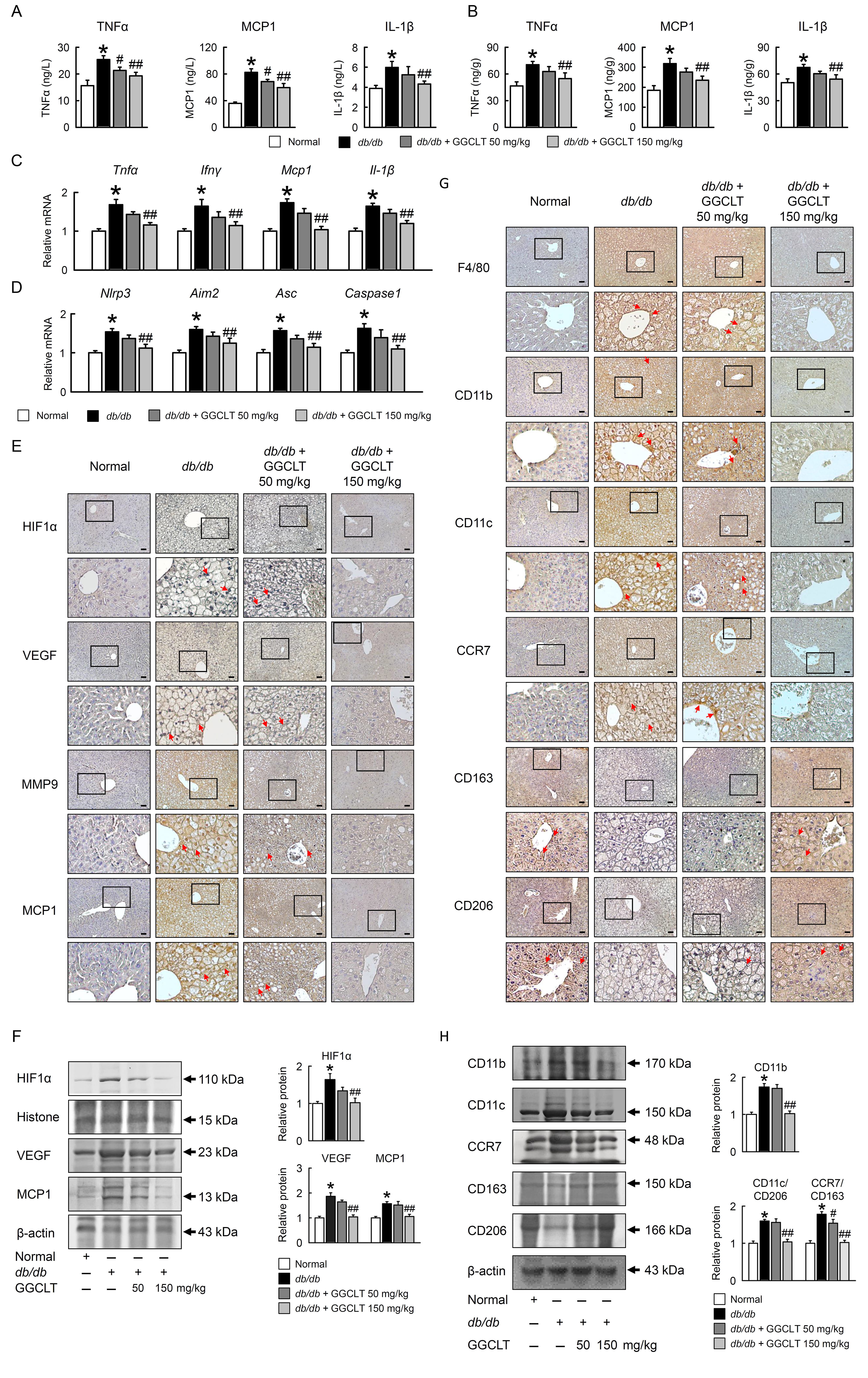 F4/80-positive macrophage infiltration in the db/db mce was considerably enhanced in the liver, which corresponded to the level of serum inflammatory cytokine expression. Macrophage infiltration in the group administered GGCLT 150 mg/kg was significantly lower than that in the db/db mice (Fig. 4G,H). Next, we examined whether macrophagy polarization is involved in NAFLD in db/db mice by assesing M1/M2 marker expression. Immunohistochemistry analysis showed a significant reduction in F4/80, CD11b, CD11c, CCR7 and increase in CD163, CD206 protein level in db/db mice treated with GGCLT 150 mg/kg compared to db/db mice (Fig. 4G,H).