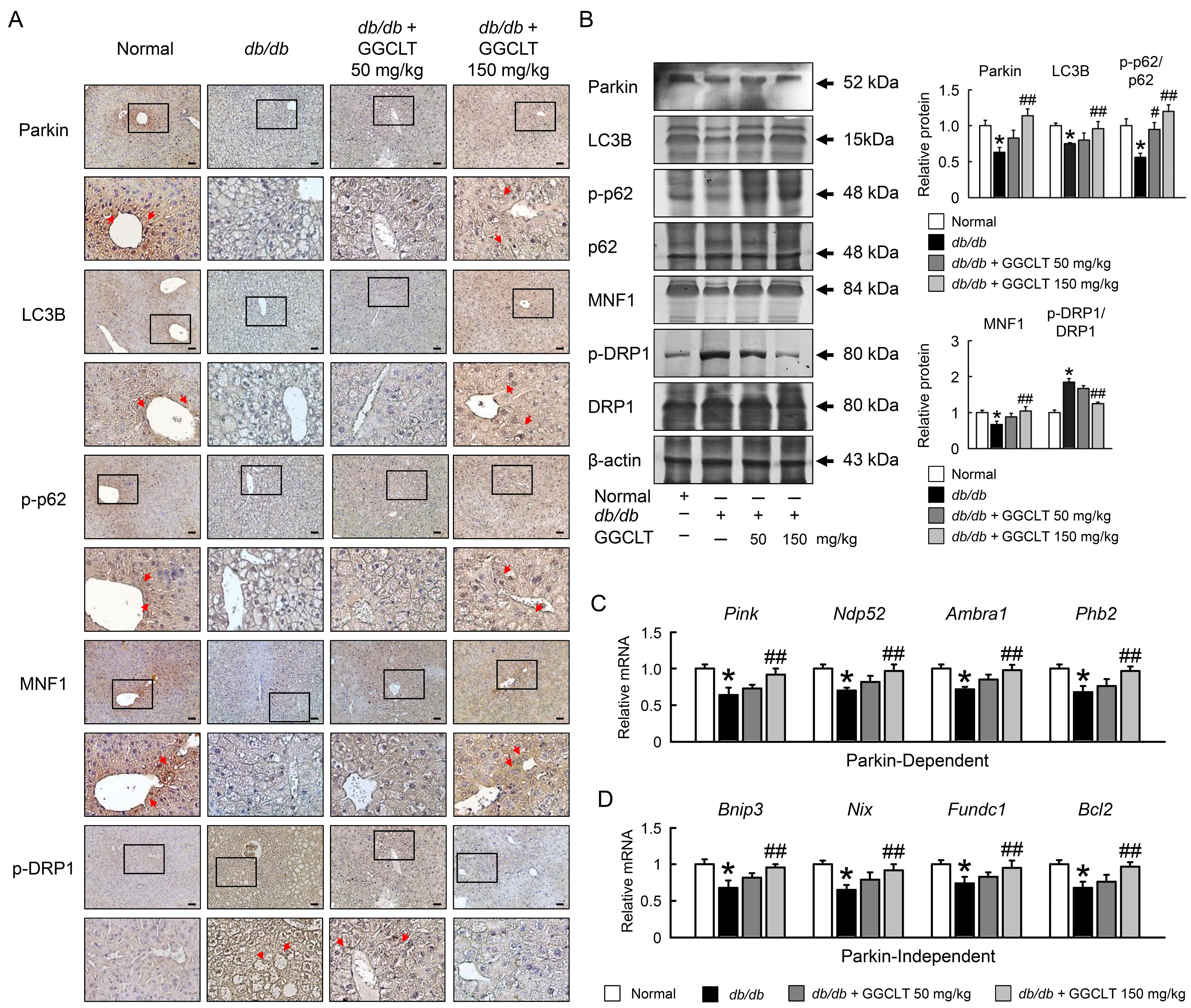 Compared to normal mice, the protein expression levels of Parkin, LC3B, phospho (p)-p62, and mitofusin-1 (MNF1) in the liver of db/db mice were decreased but phospho-dynamin-related protein (p-Drp1) expression was increased (Fig. 6A,B). The GGCLT administration for 28 days, the opposite expression patterns were observed (Fig. 6A,B). Moreover, GGCLT effectively enhanced the expression of Parkin-dependent/independent mitophagy pathway, including Pink, calcium binding and coiled-coil domain 2 (Ndp52/Calcoco2), prohibitin 2 (Phb2), autophagy and beclin 1 regulator 1 (Ambra1), B-cell lymphoma 2 (Bcl2), BCL2 interacting protein 3 (Bnip3), FUN14 domain containing 1 (Fundc1) compared to db/db mice (Fig. 6C,D).
