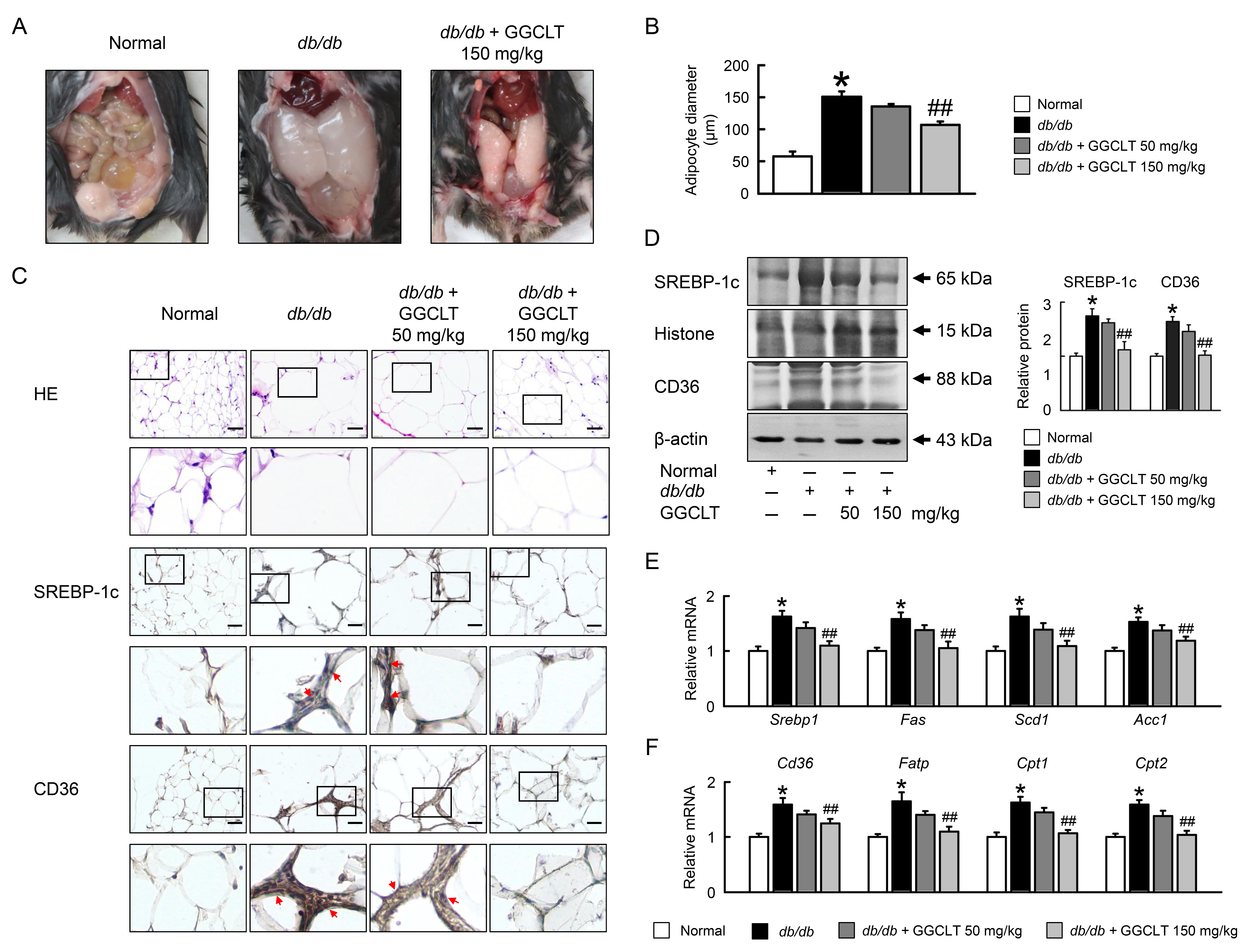 The shape of EWAT and adipocyte diameter size were large in db/db compared with normal mice (Fig. 7A,B), and GGCLT 150 mg/kg significant reduced EWAT size and adipocyte diameter size. GGCLT resulted in dramatically reduced the SREBP-1c and target genes, Fas, SCD1, Scd1, as well as fatty acid transporters (Cd36, Fatp, Cpt1 and Cpt2) mRNA expression in EWAT of db/db mice (Fig. 7C–F). Moreover, GGCLT significantly reduced hepatic lipogenesis and fatty acid transporters, suggesting that GGCLT regulated lipid homeostasis in db/db mice.