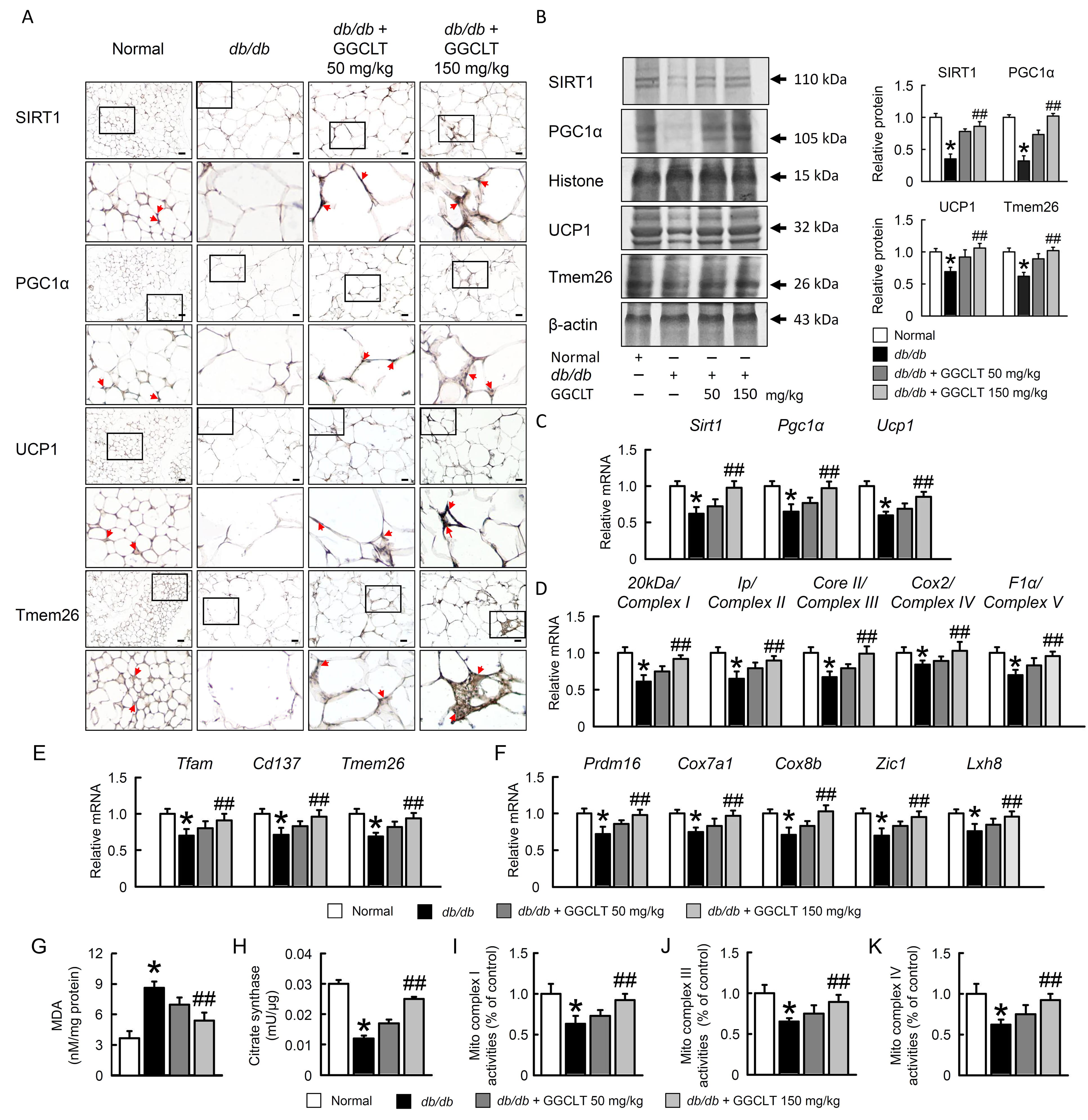 The EWAT dramatically boosted F4/80-positive macrophage infiltration in the db/db mce. Macrophage infiltration was considerably lower in the GGCLT group than in the db/db mice (Fig. 8E). Macrophages were increased in EWAT of db/db mice were due to an increase in CD11b, CD11c, and CCR7 compared with normal mice. GGCLT reduced macrophage infiltration (F4/80, CD11b) and M1 macrophage markers (CD11c, CCR7) in EWAT of db/db mice (Fig. 8E,F). On the contrary, GGCLT 150 mg/kg enhanced M2 macrophage markers (CD163, CD206) protein levels in EWAT of db/db mice (Fig. 8E,F).