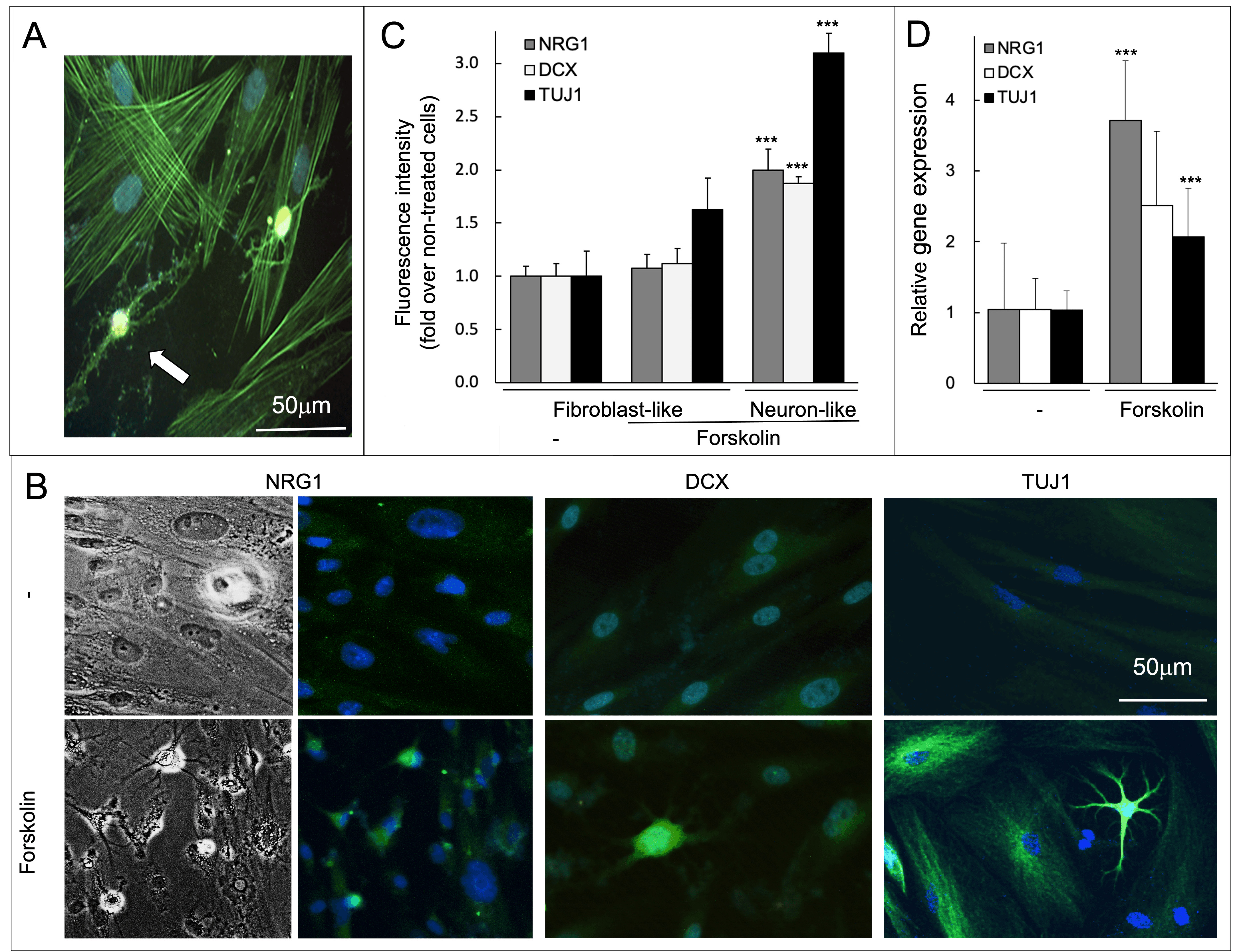 Neuron-like cells were clearly different from fibroblasts because they manifested a number of protrusions and smaller nuclei, as compared to the larger, flat fibroblast phenotype. The number of neuron-like cells was quantified by manual counting using the Plugin Cell Counter of the software ImageJ Fiji (version 2.1.0/1.53c, NIH, Bethesda, Maryland, USA).